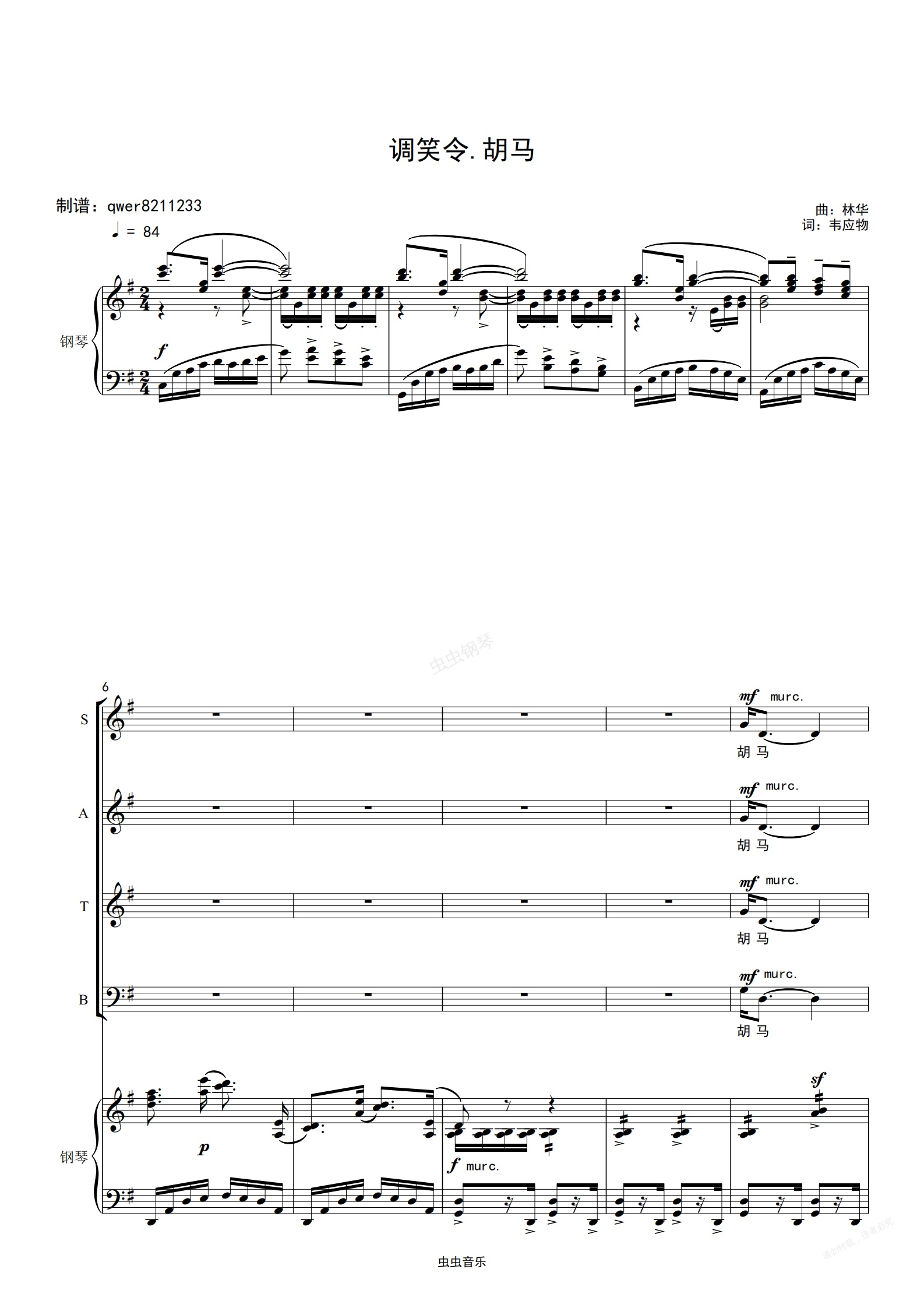 钢琴谱:调笑令(合唱总谱)
