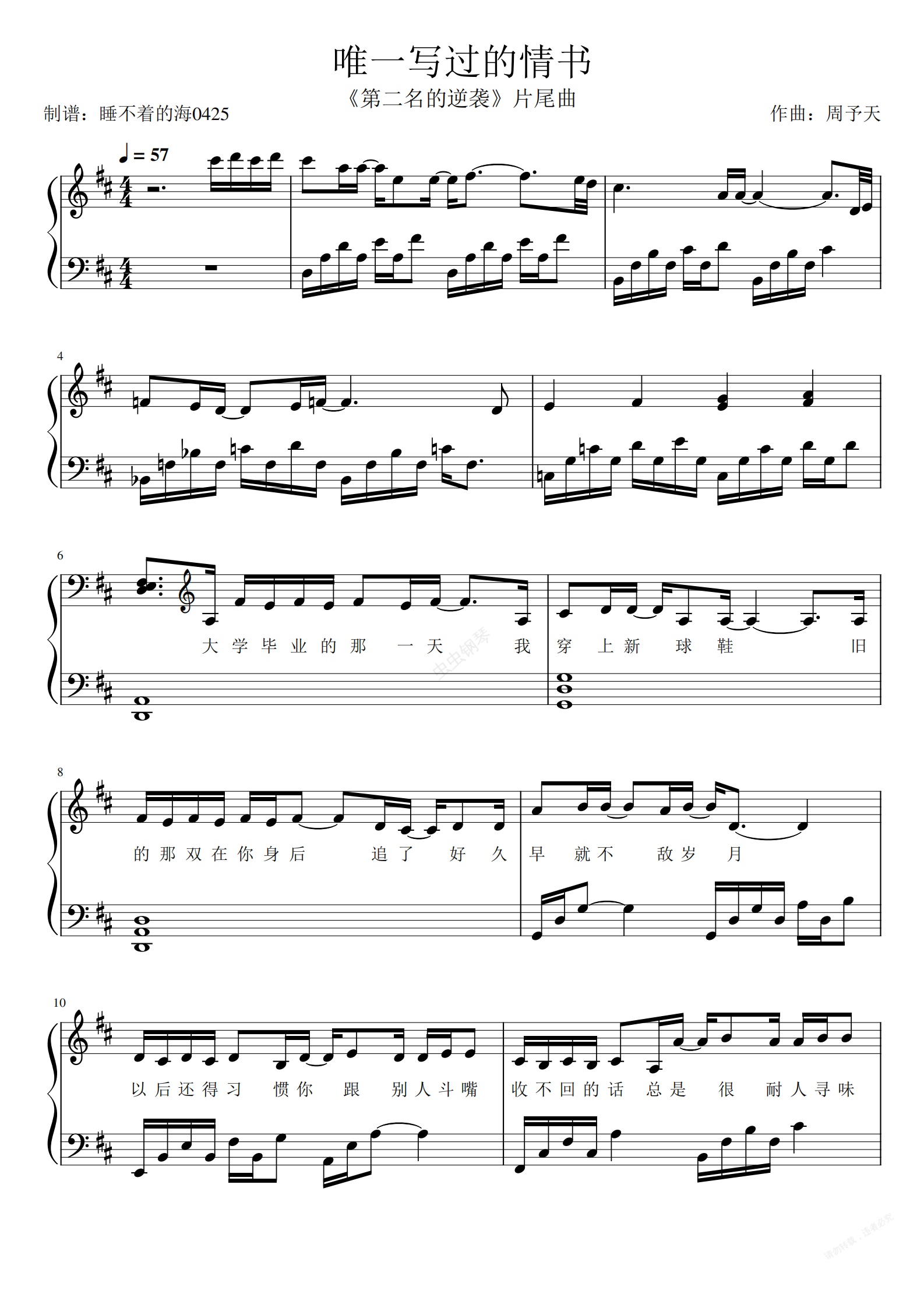 钢琴谱:唯一写过的情书 第二名的逆袭片尾曲