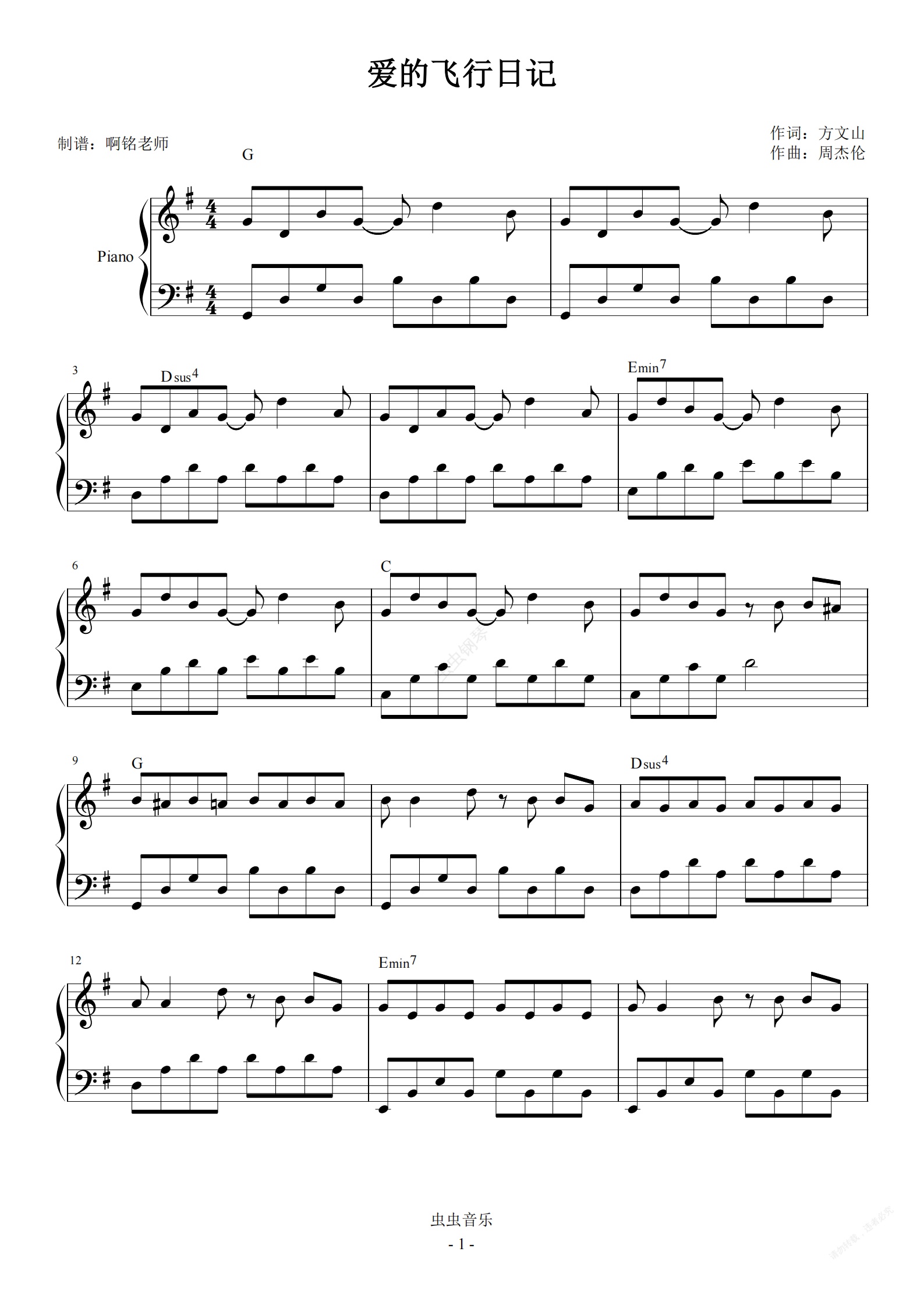 钢琴谱:爱的飞行日记 G调简易 原曲和弦