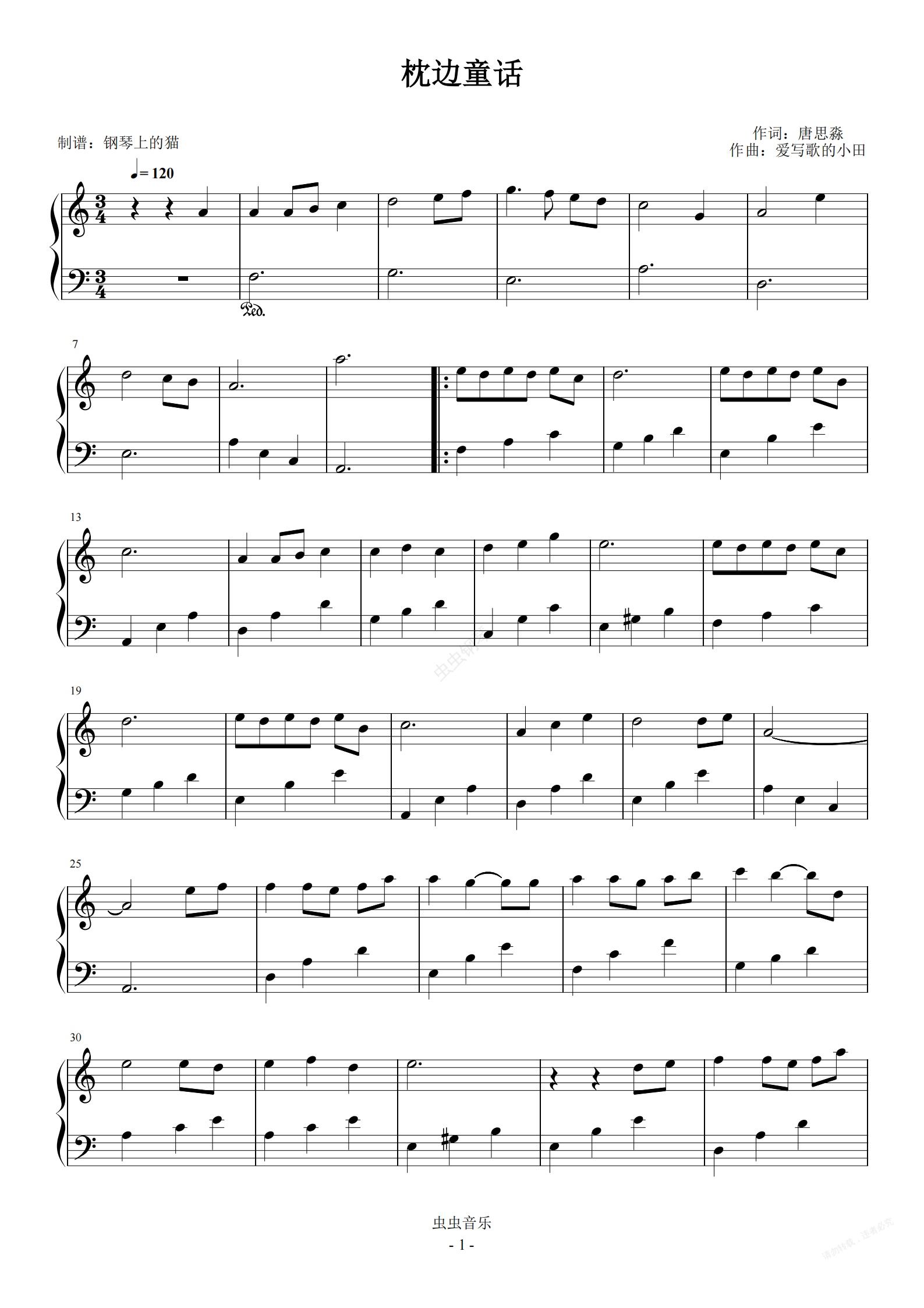 钢琴谱:枕边童话 C调简易版