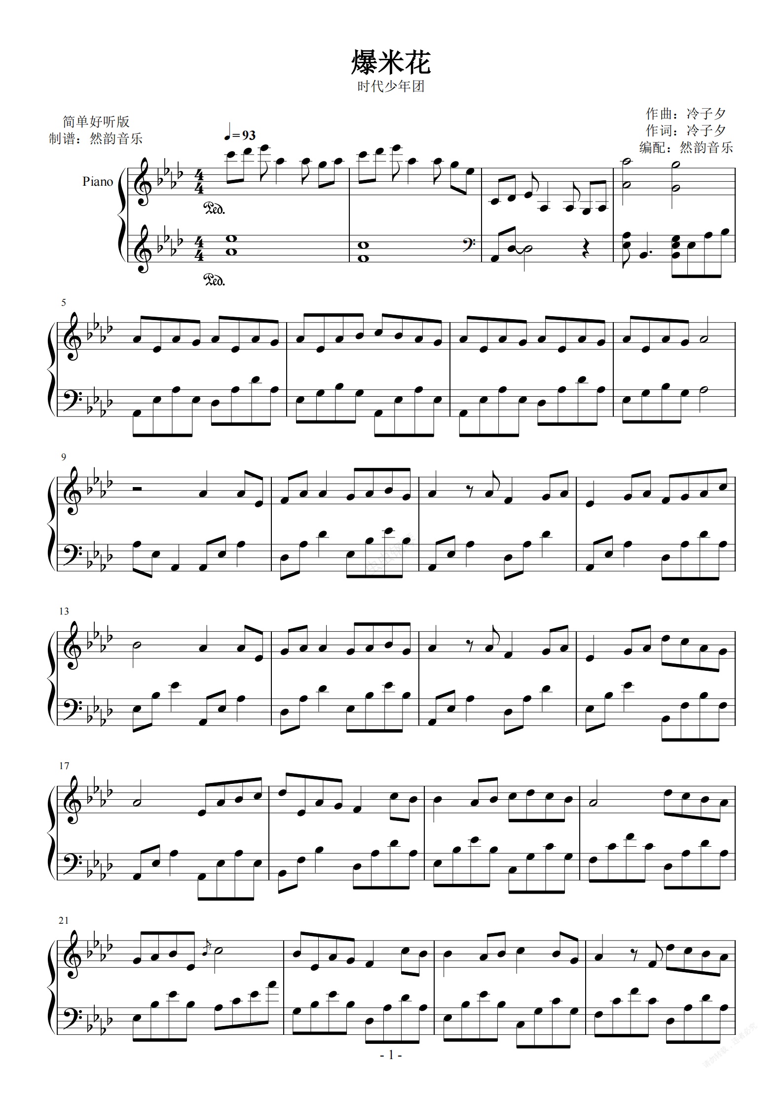 钢琴谱:爆米花-TNT时代少年团【简单易学版】然韵音乐编配