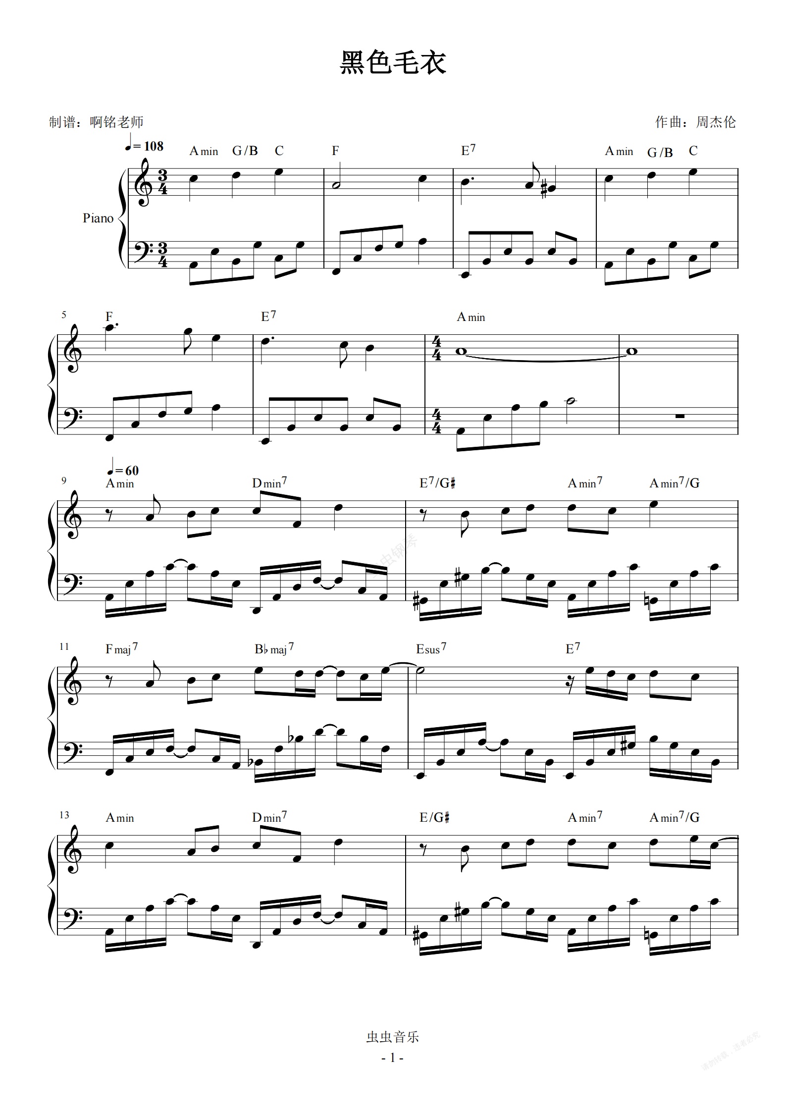 钢琴谱:黑色毛衣 C调简易 原版和弦