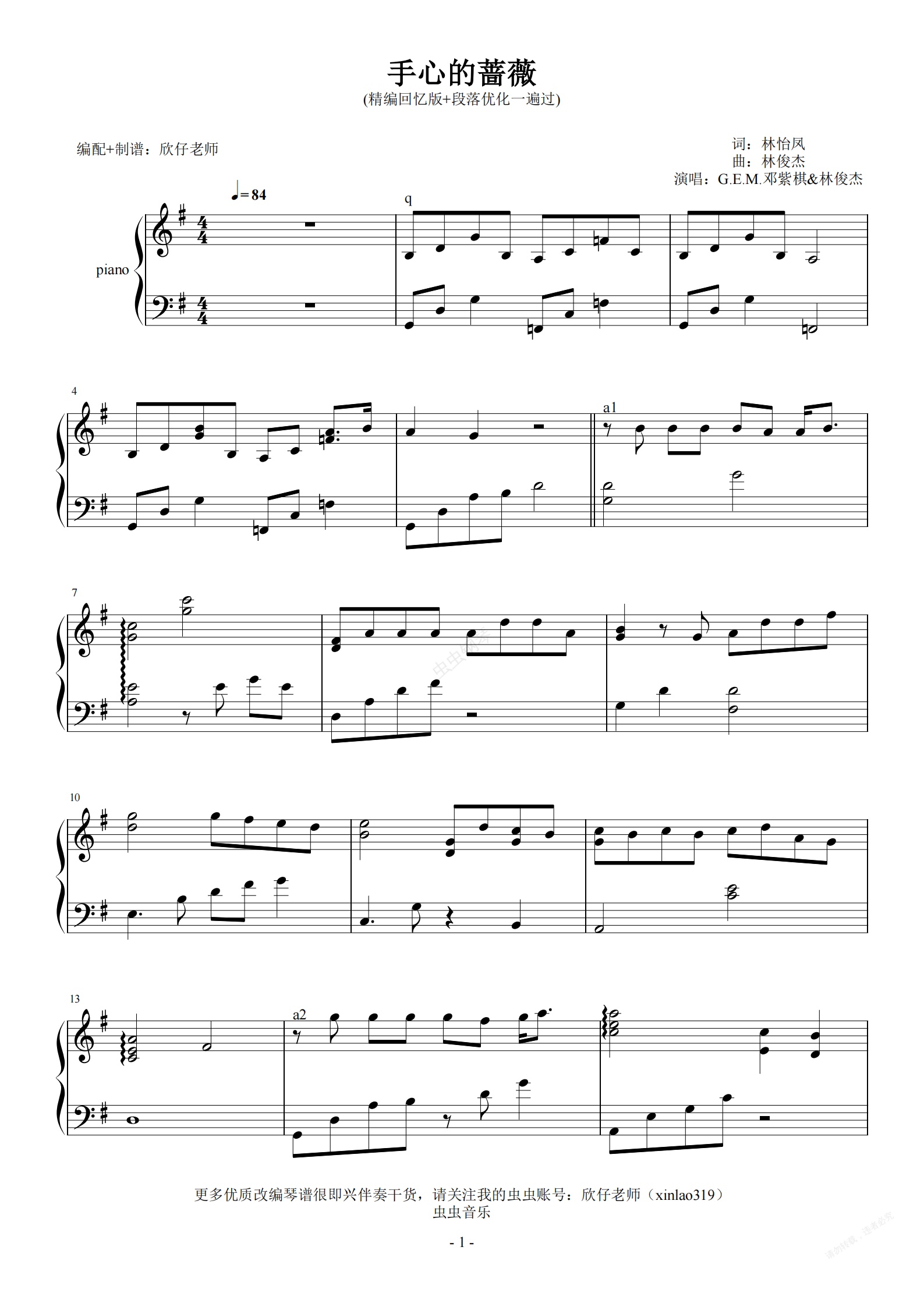 钢琴谱:林俊杰&邓紫棋《手心的蔷薇》(精编回忆版+段落优化一遍过)
