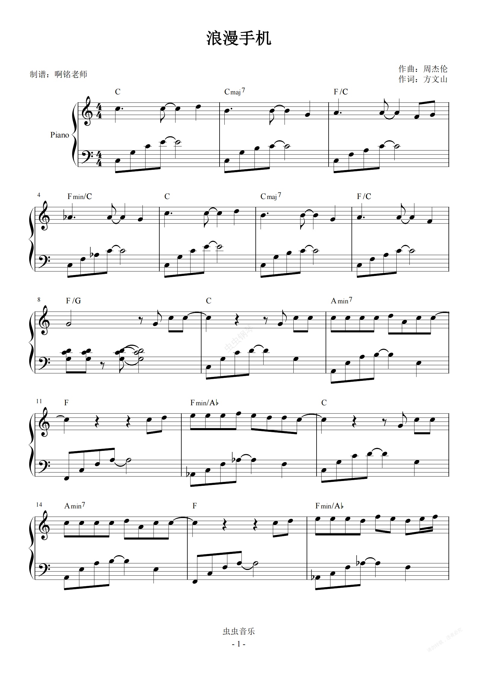 钢琴谱:浪漫手机 C调简易 原版和弦