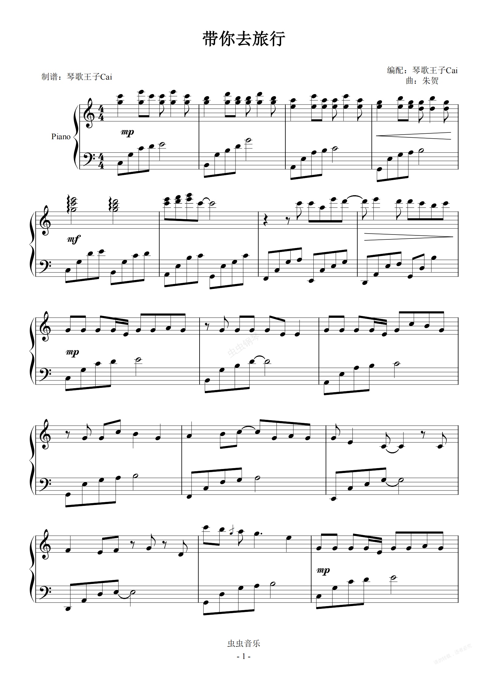 钢琴谱:带你去旅行(琴歌王子Cai钢琴版)C调
