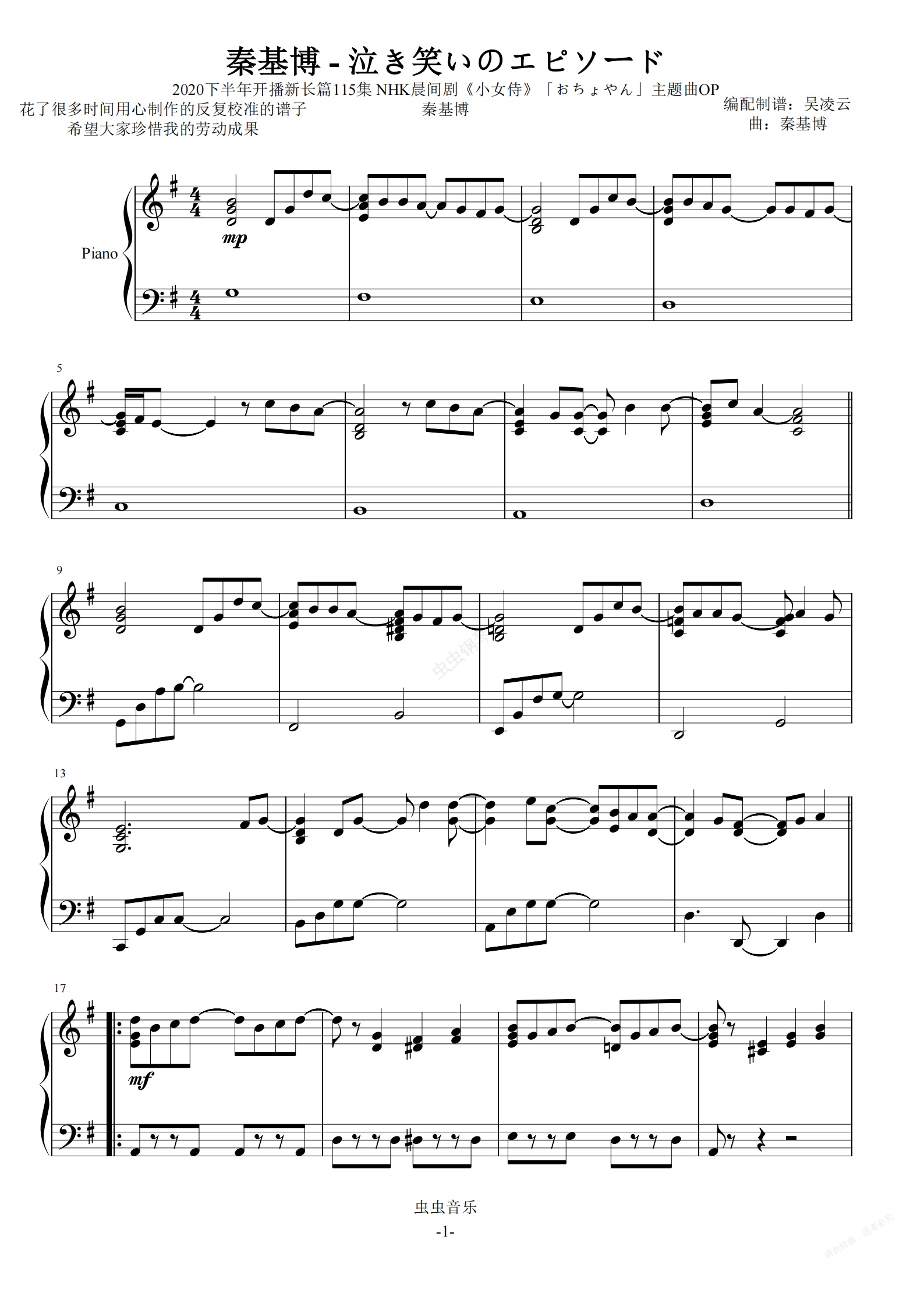 钢琴谱:泣き笑いのエピソード-秦基博 NHK最新晨间剧《小女侍》「おちょやん」主题曲OP 吴凌云演奏钢琴版