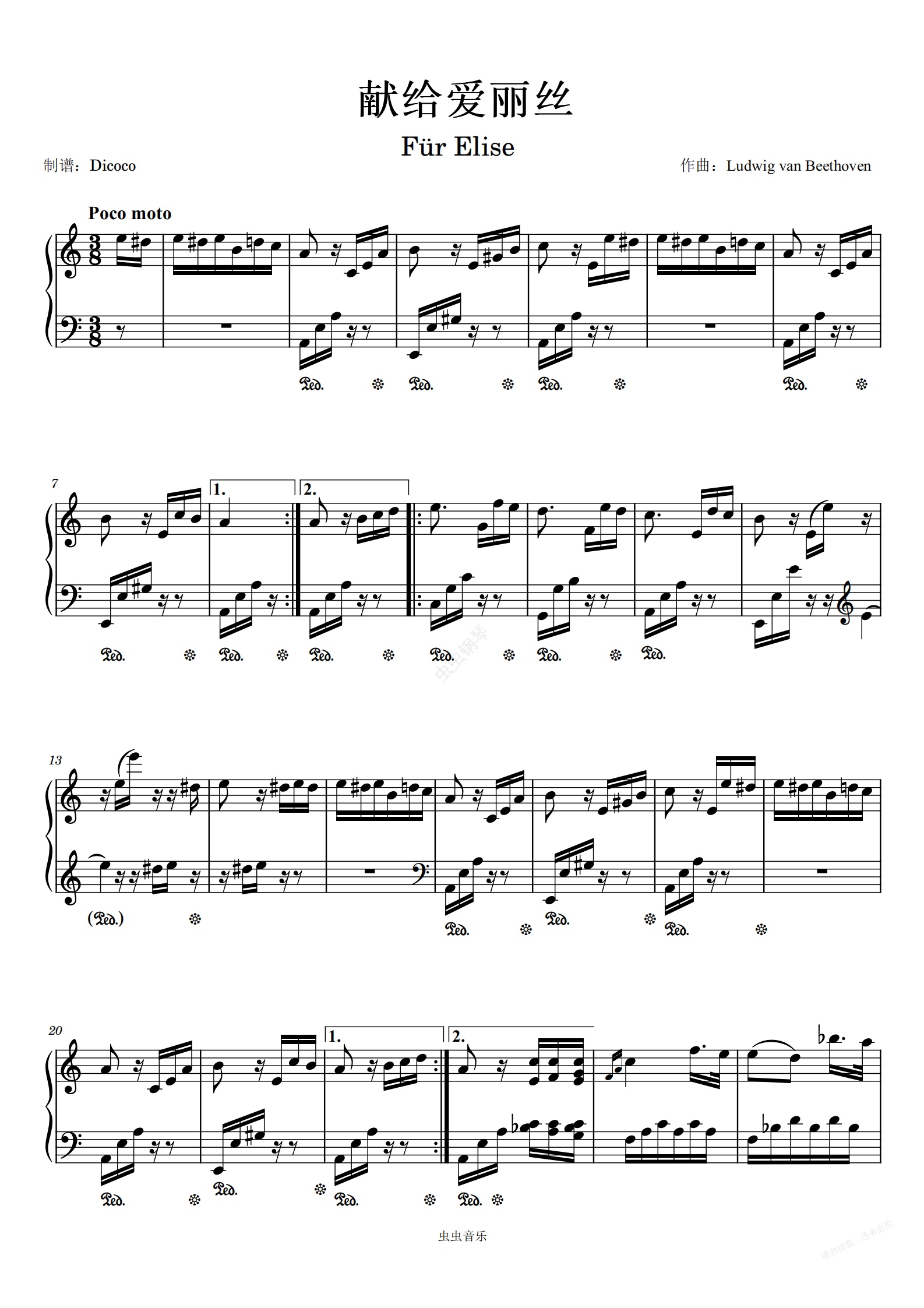 钢琴谱:献给爱丽丝 贝多芬 致特蕾莎 致爱丽丝 a小调巴加泰勒 Ludwig van Beethoven Für Elise For Elise