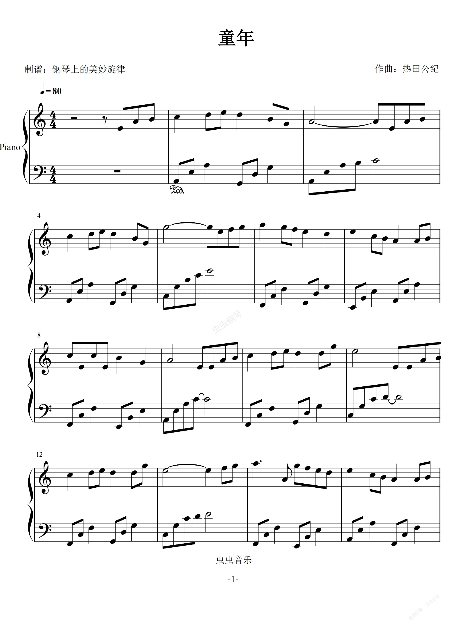 钢琴谱:童年 班得瑞 C调简易版