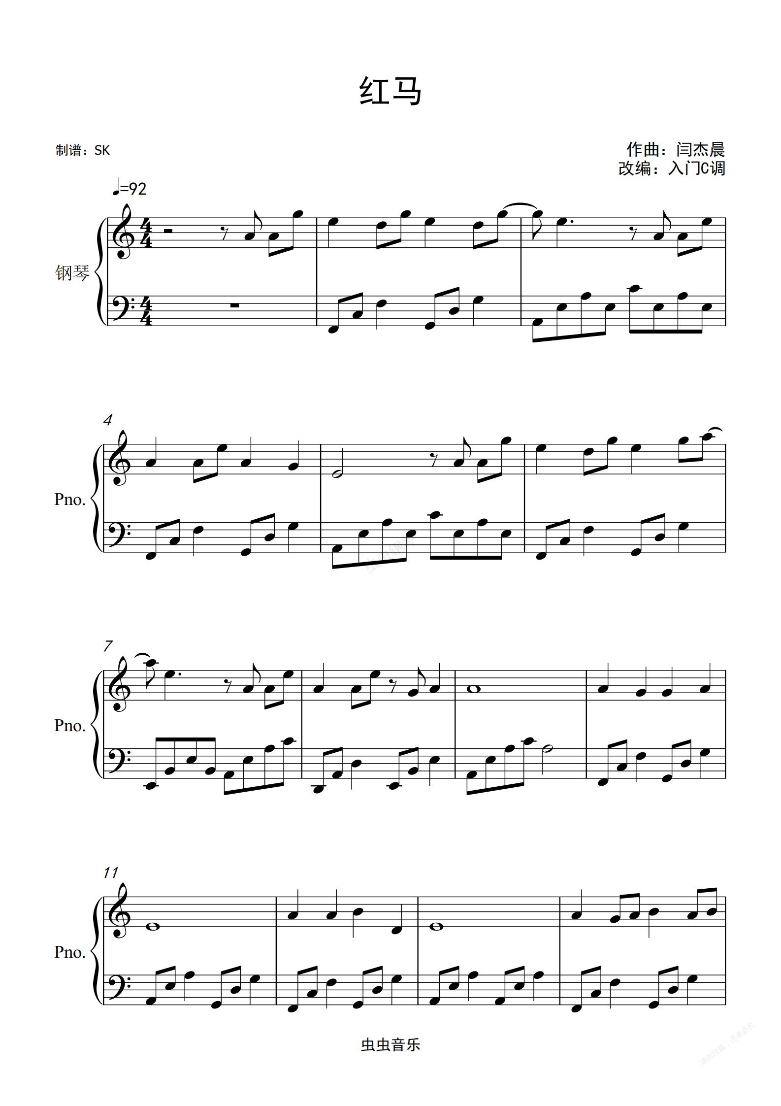 钢琴谱:一颗狼星_许篮心《红马》C调抒情简单版