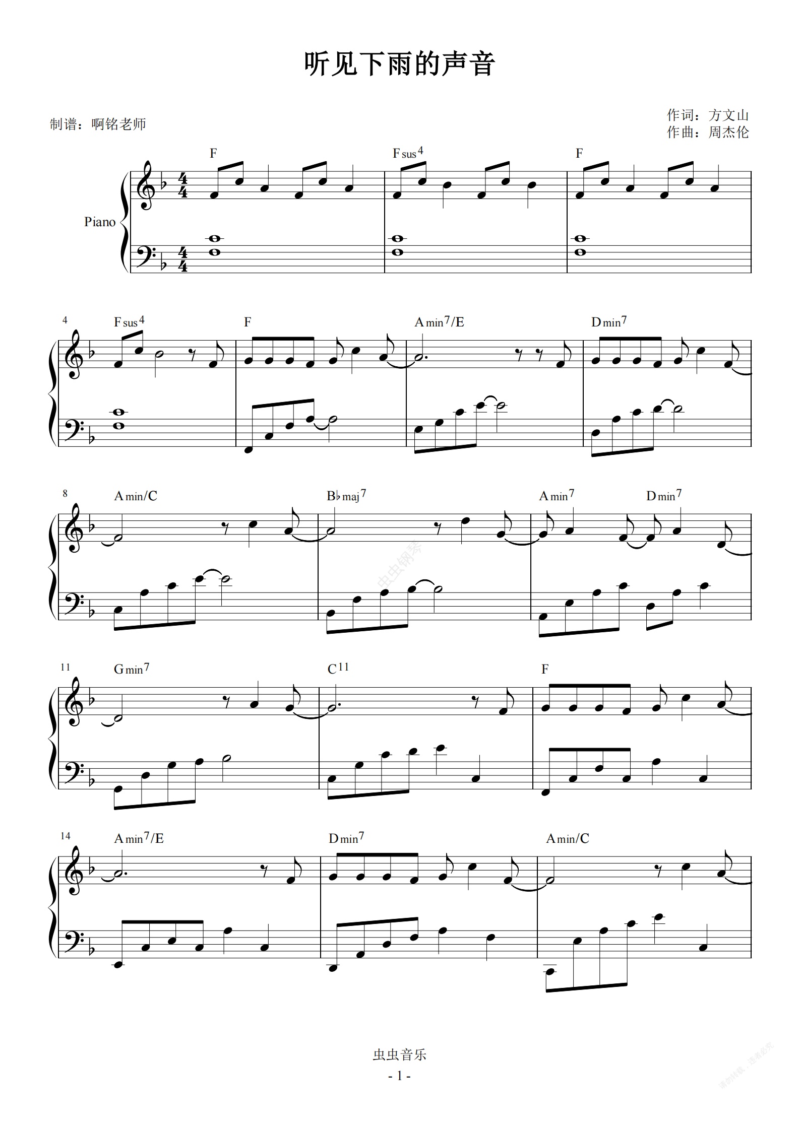 钢琴谱:听见下雨的声音 F调简易 原曲和弦