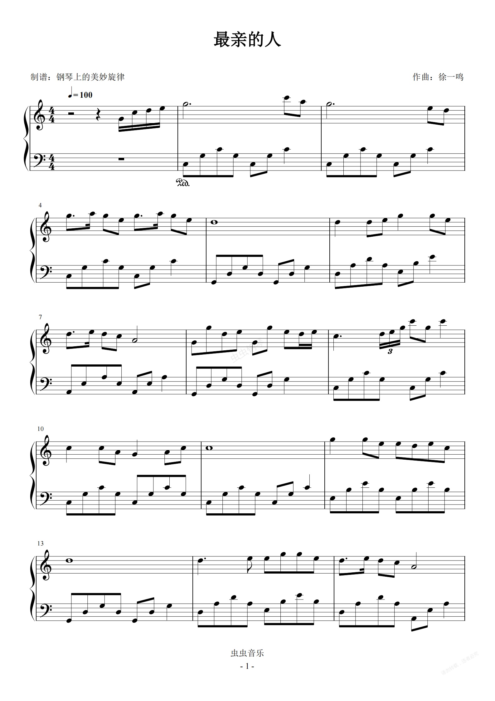 钢琴谱:最亲的人 C调简易版