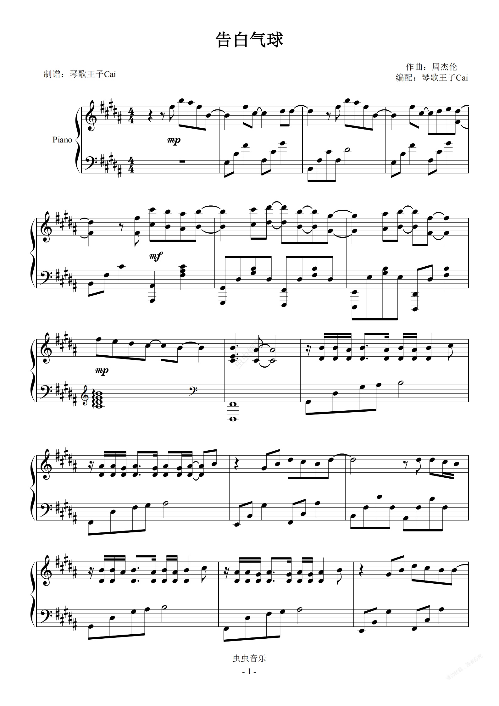 钢琴谱:告白气球(琴歌王子Cai钢琴版)原调
