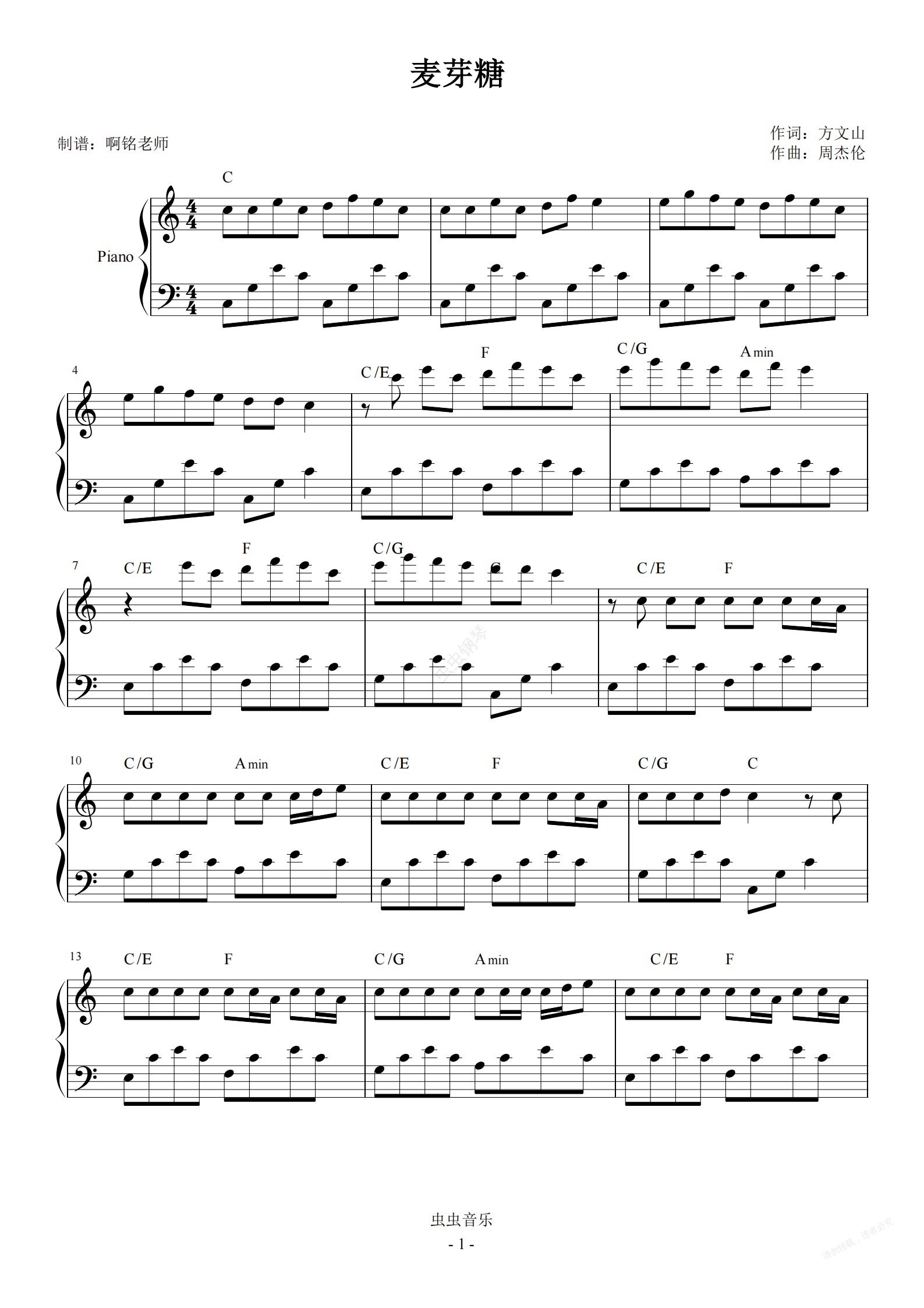 钢琴谱:麦芽糖 C调简易 原曲和弦