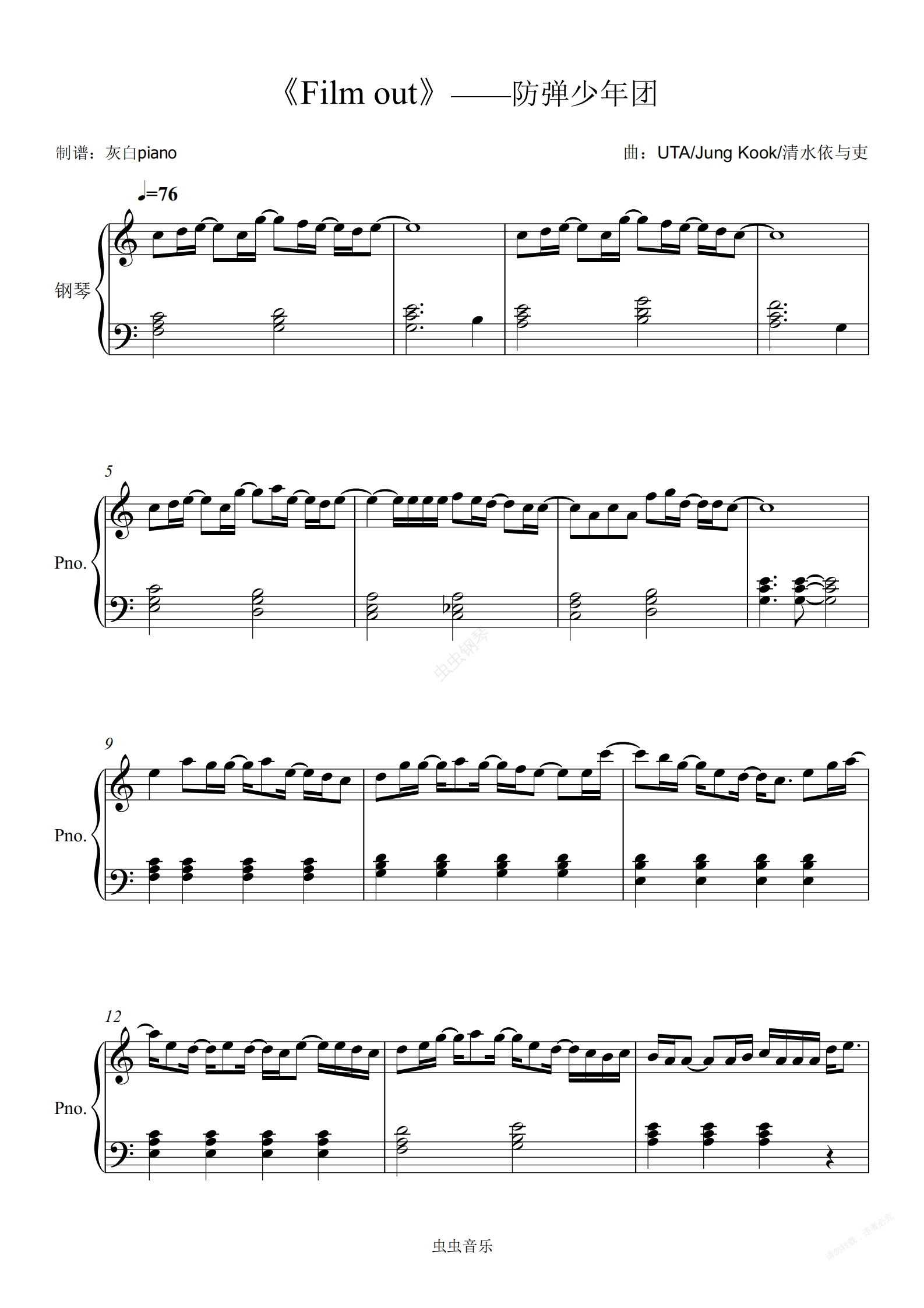 钢琴谱:《Fiml out》防弹少年团-C调版  -灰白