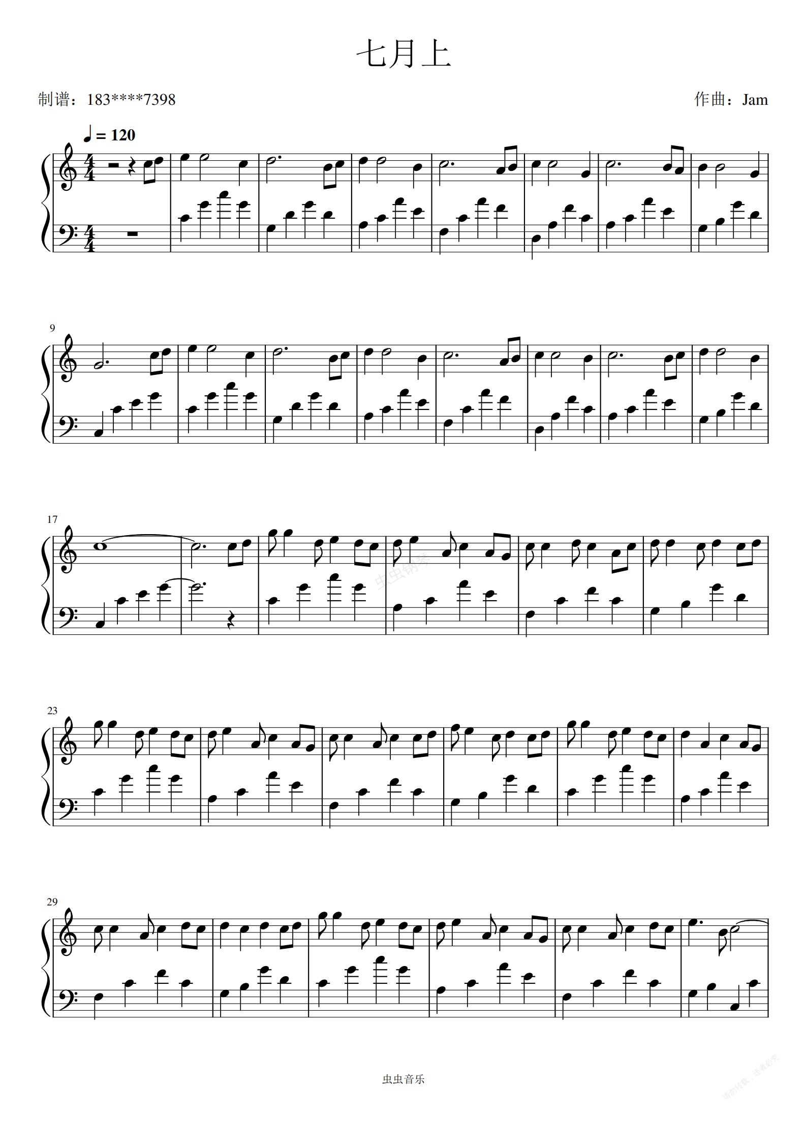钢琴谱:七月上 C调 简单好听
