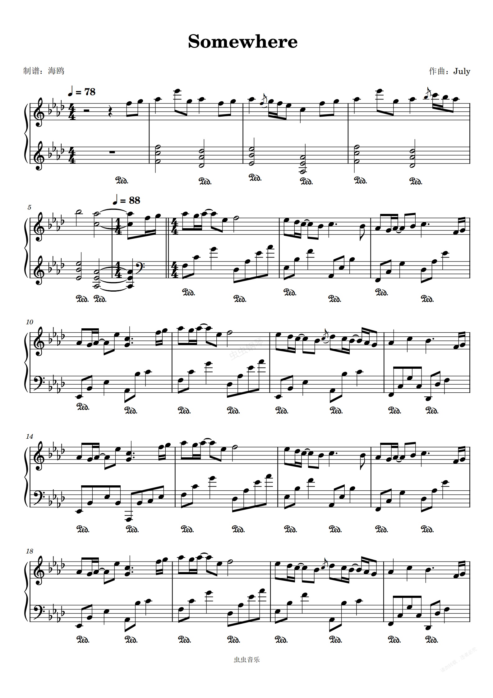 钢琴谱:Somewhere-July