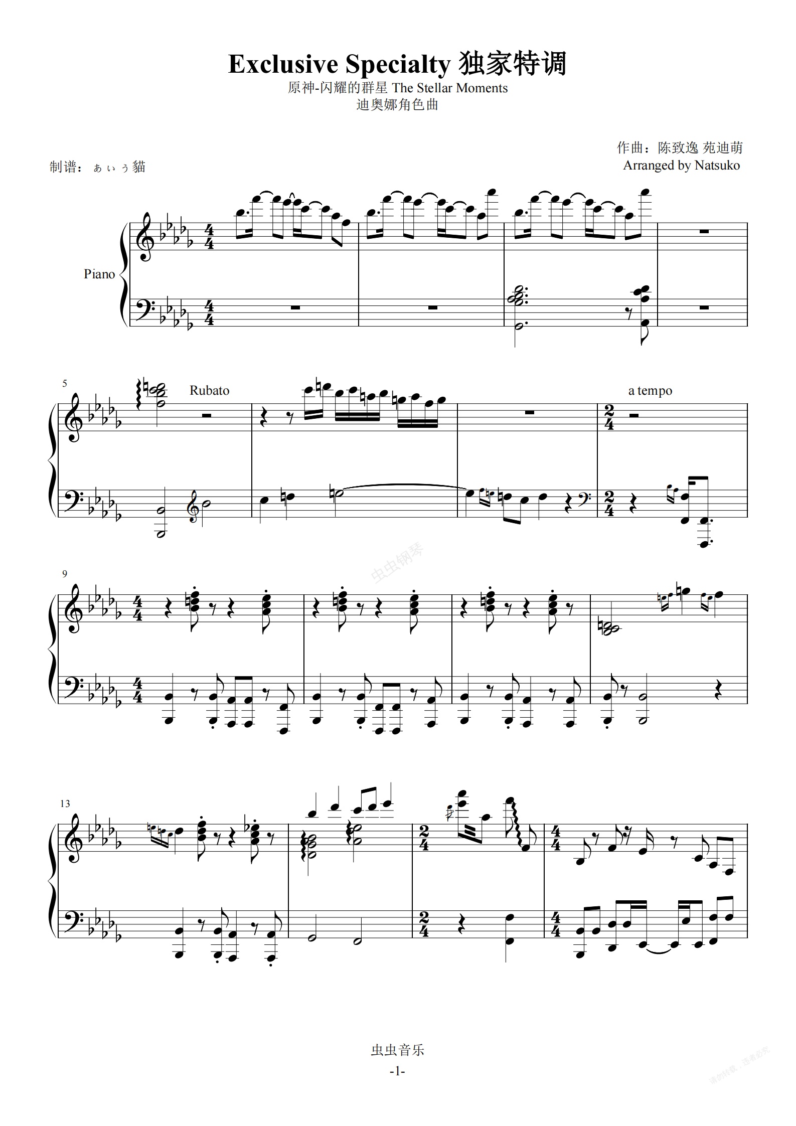 钢琴谱:原神-迪奥娜角色曲-Exclusive Specialty 独家特调