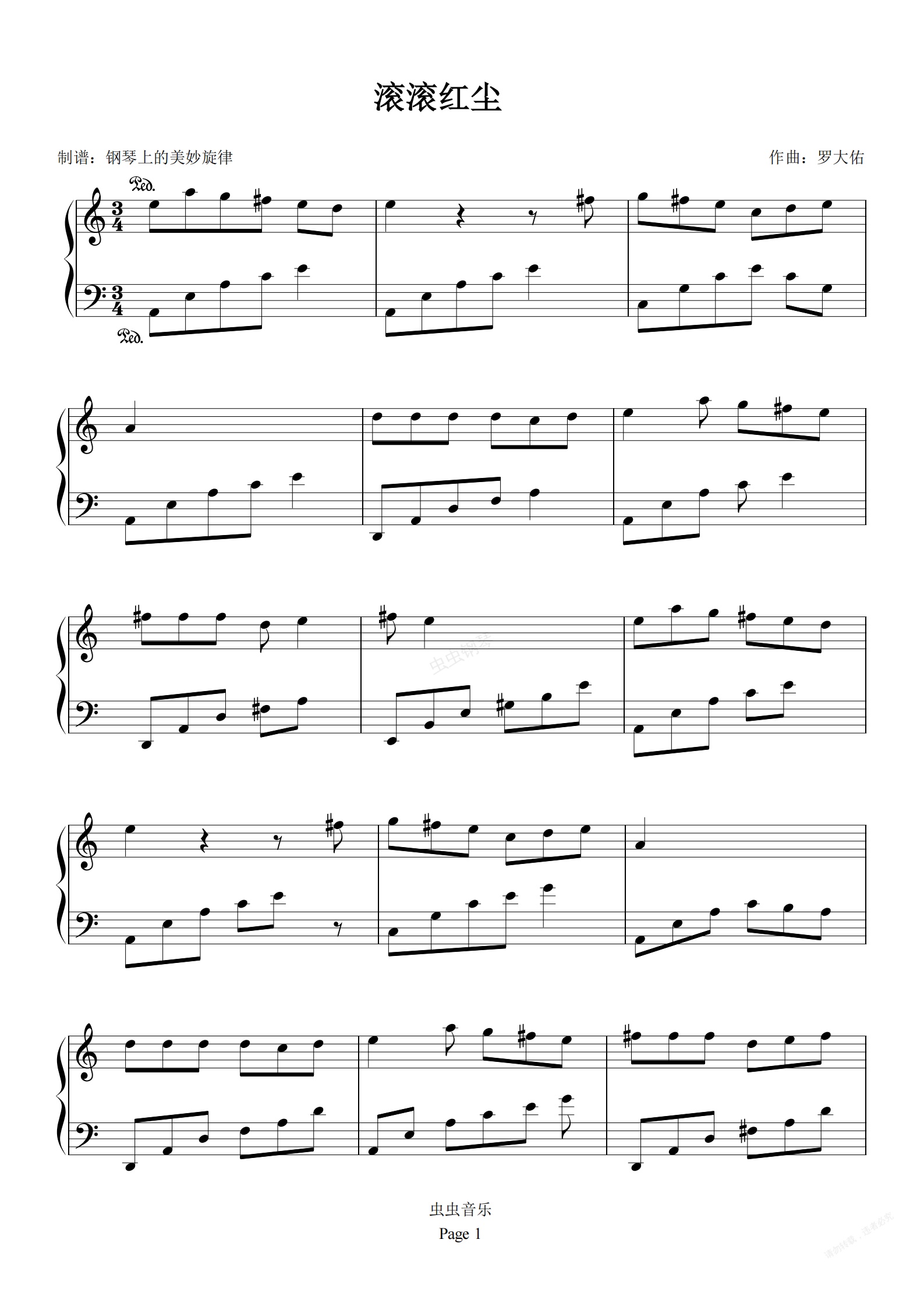 钢琴谱:滚滚红尘 C调简易版  经典的回忆