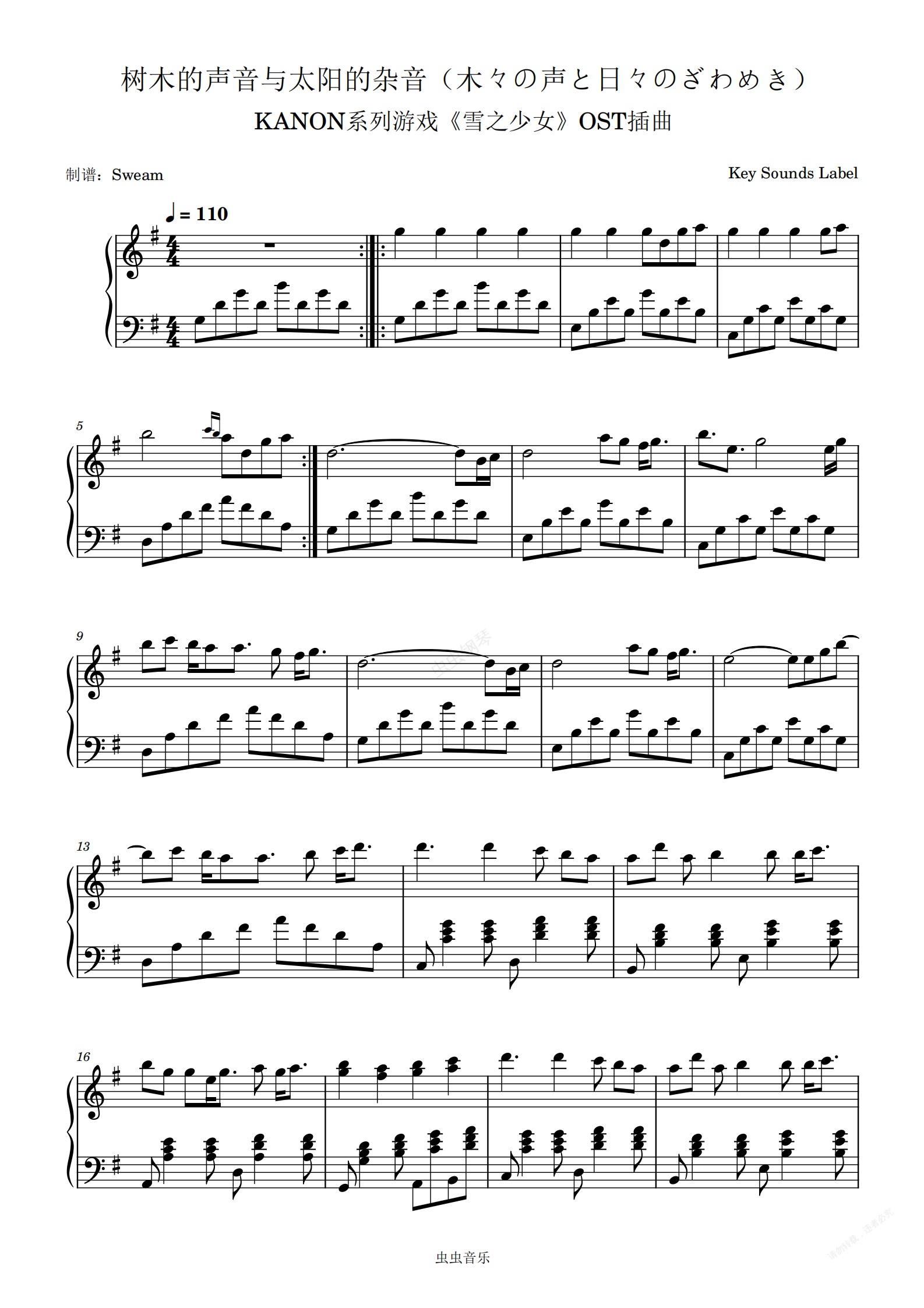 钢琴谱:树木的声音与太阳的杂音(木々の声と日々のざわめき)-KANON系列游戏《雪之少女》OST插曲