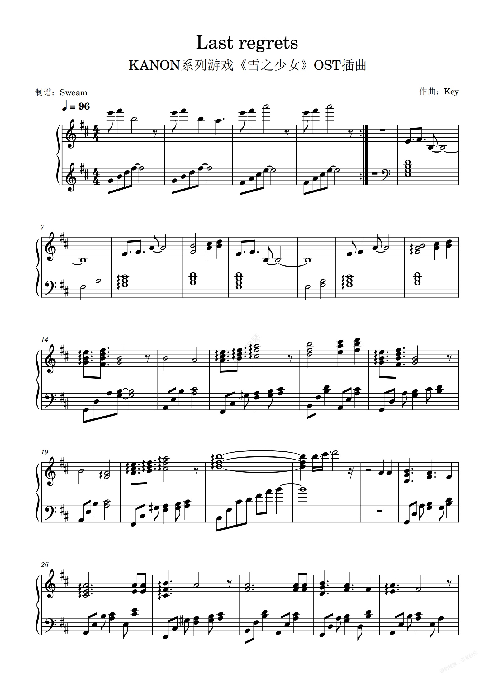 钢琴谱:Last regrets-KANON系列游戏《雪之少女》OST插曲