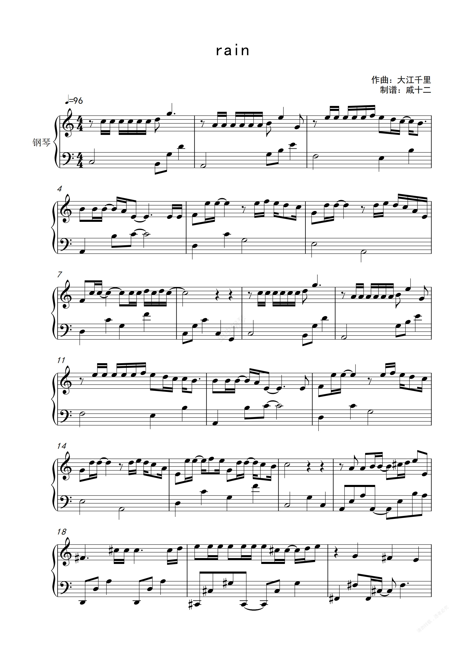 钢琴谱:rain《言叶之庭》片尾曲-C调简单版