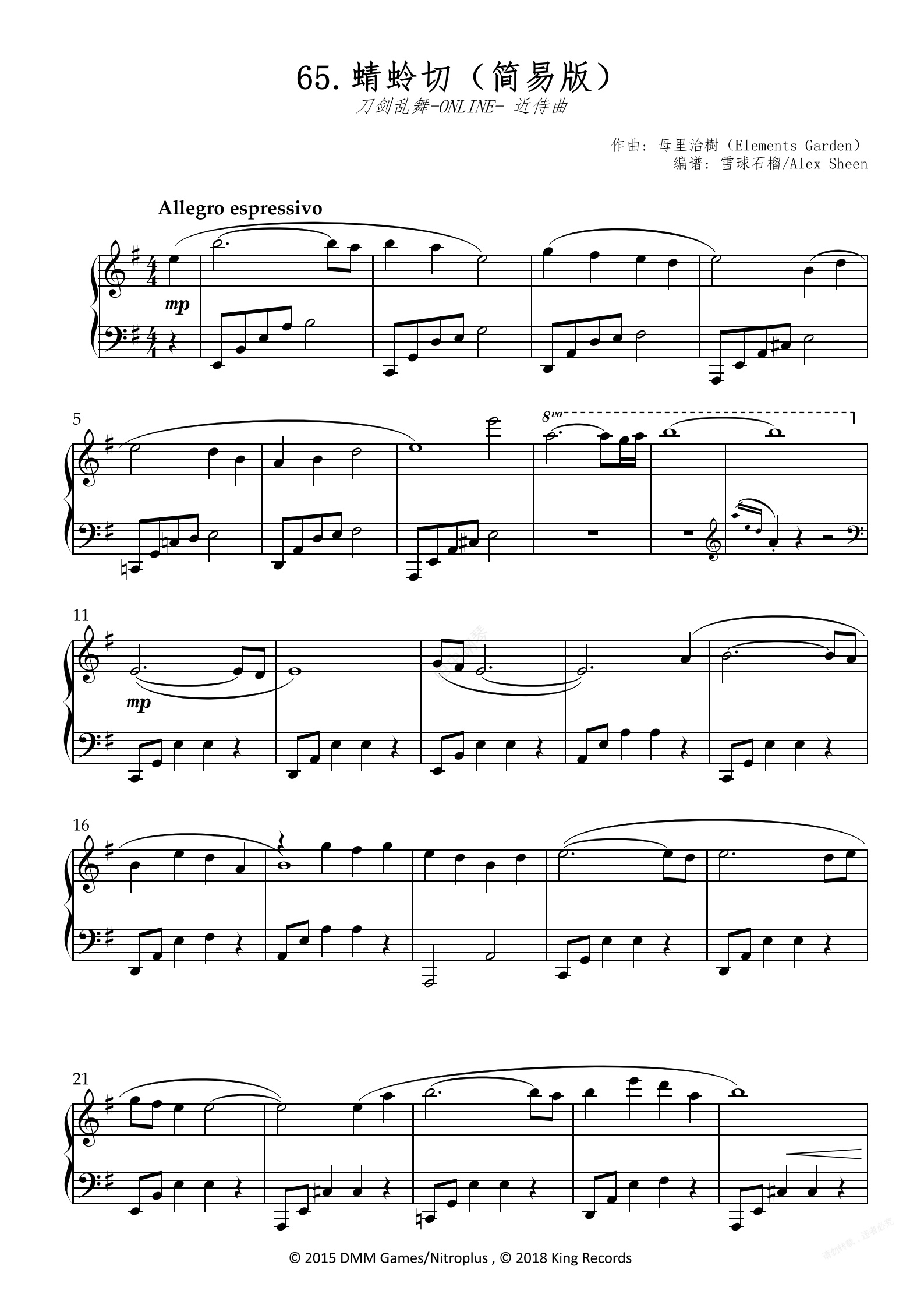 钢琴谱:蜻蛉切 近侍曲【刀剑乱舞】(简易版)
