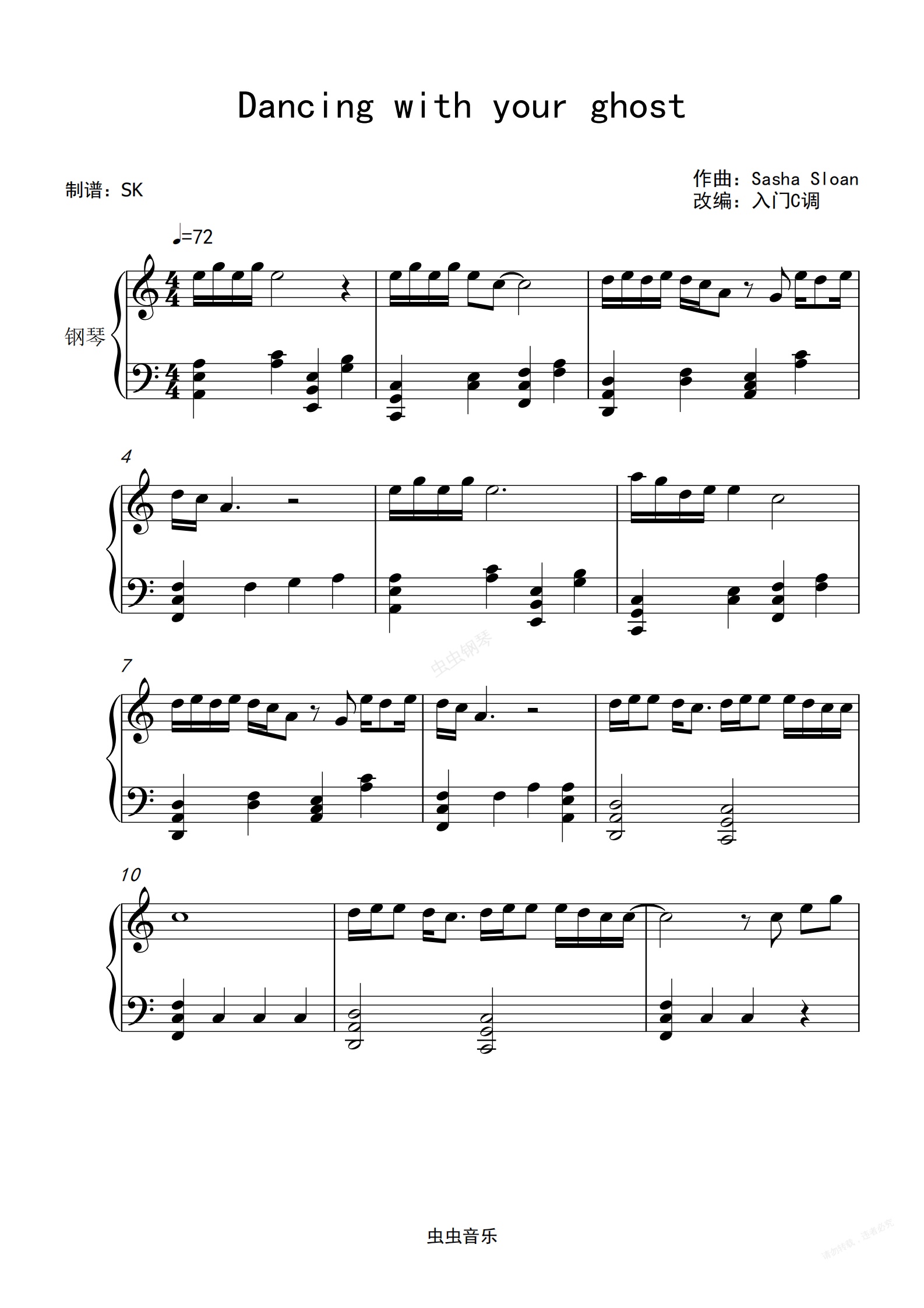 钢琴谱:Sasha Sloan抖音BGM《Dancing with your ghost》C调简单版