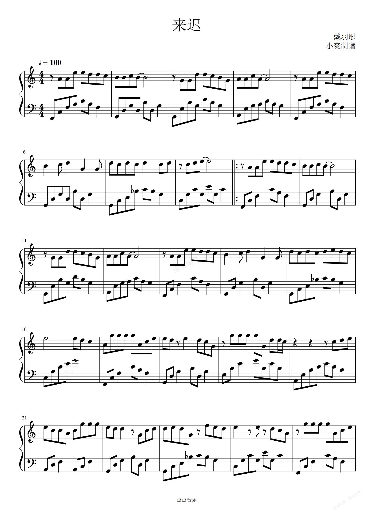 钢琴谱:来迟
