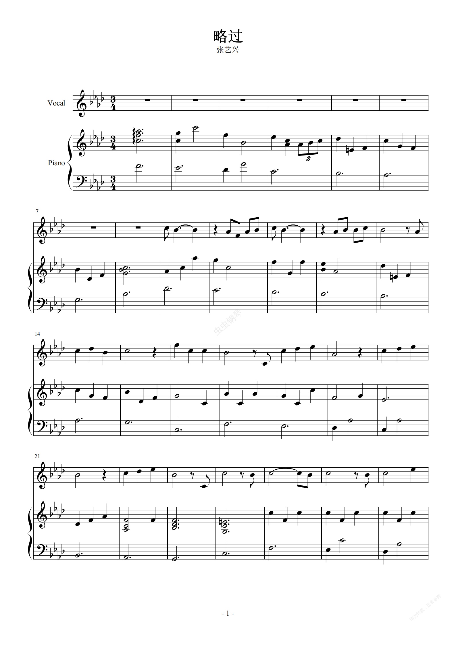 钢琴谱:略过-张艺兴(弹唱谱)