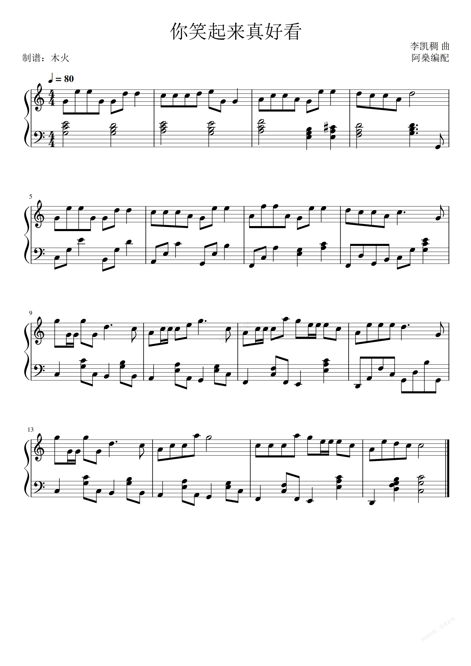 钢琴谱:你笑起来真好看(C调简单版)-阿燊编配
