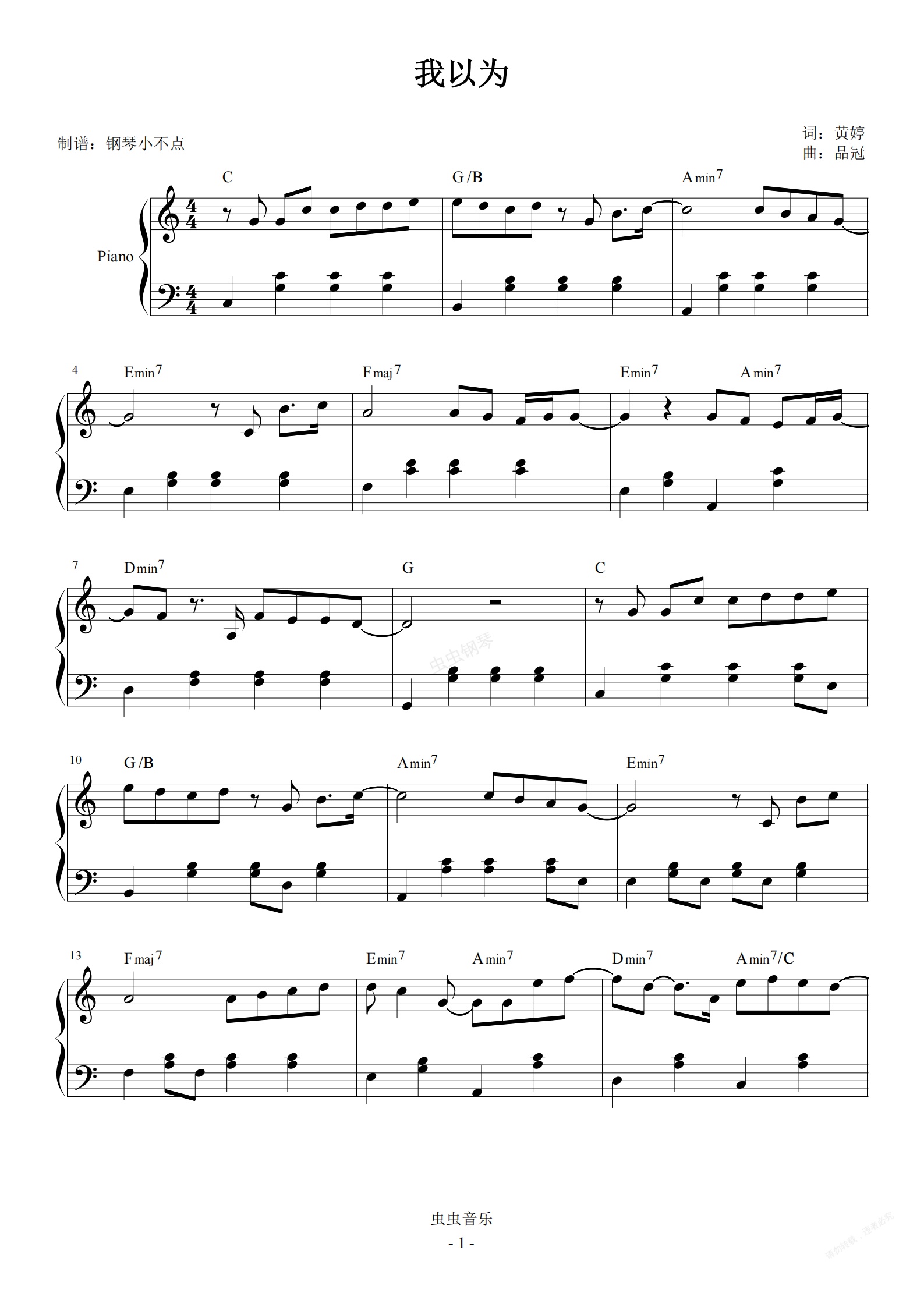 钢琴谱:我以为 简易版
