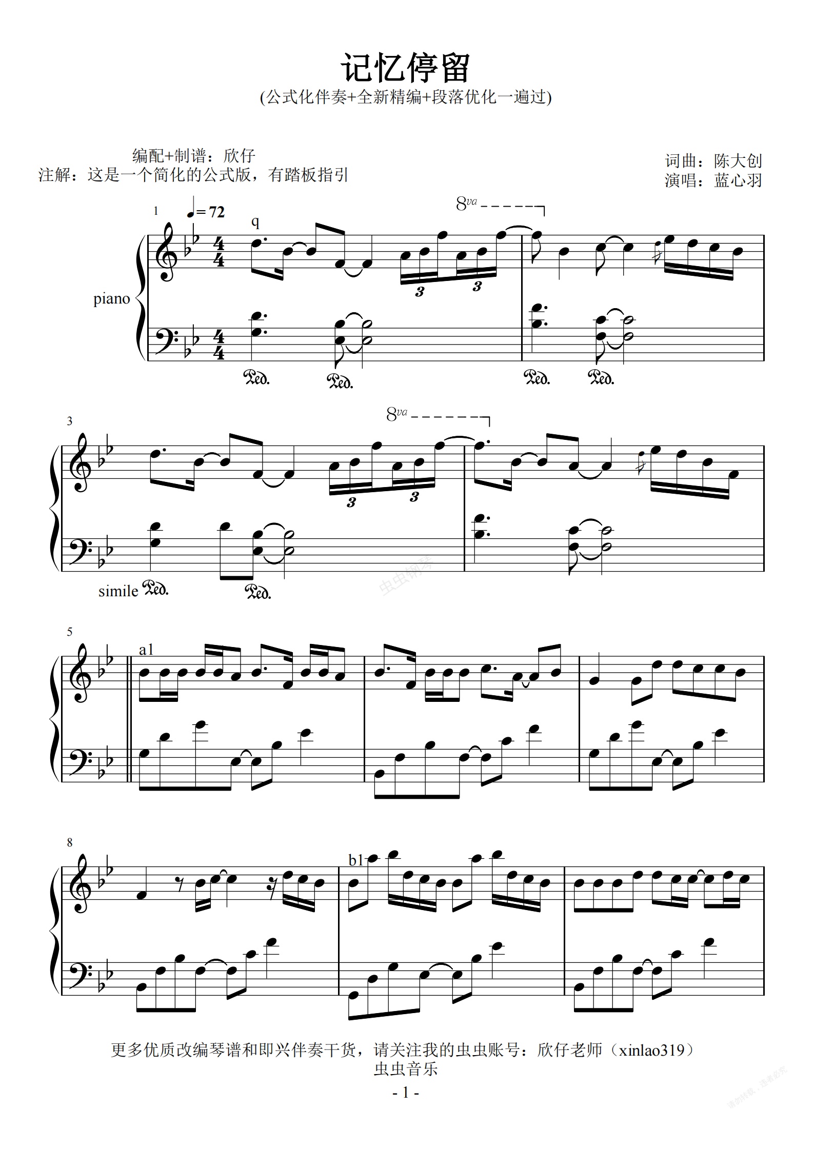 钢琴谱:蓝心羽-降B《记忆停留》(公式化伴奏+段落优化一遍过)