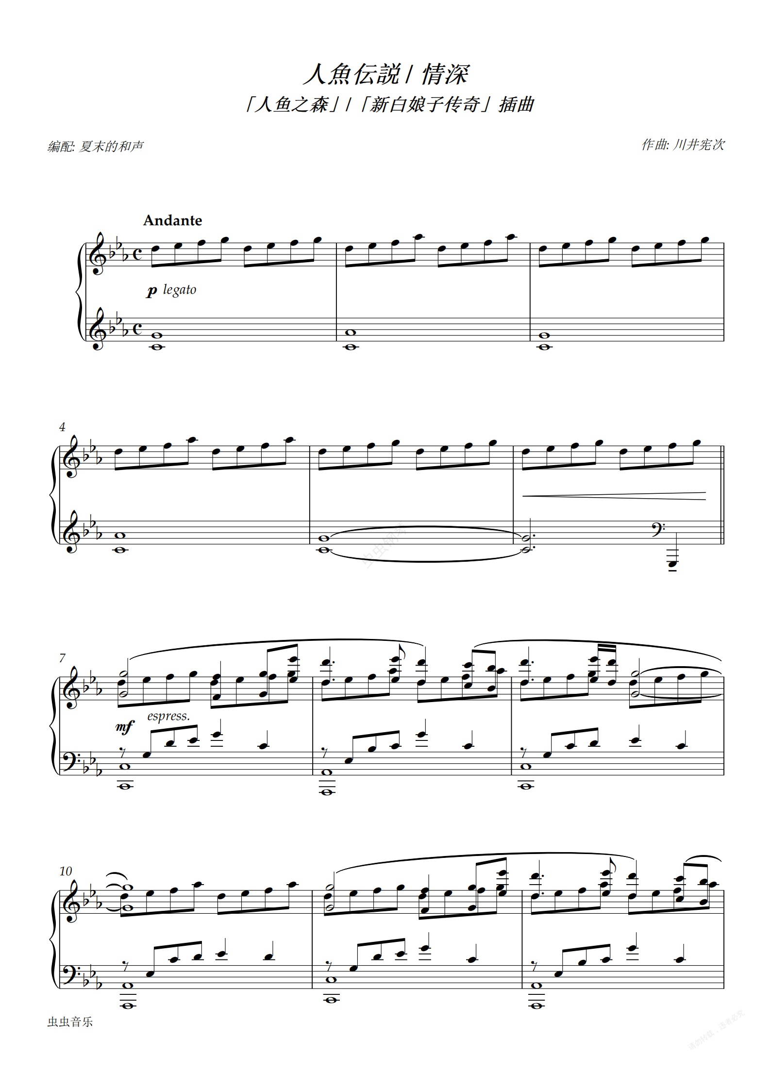 此曲原为1991年川井宪次为电影「人鱼之森」创作的配乐,后被用作国产电视剧「新白娘子传奇」的插曲,本乐谱根据原曲专业精准编谱,喜欢请收藏。更多乐谱请关注主页,欢迎留言求谱。