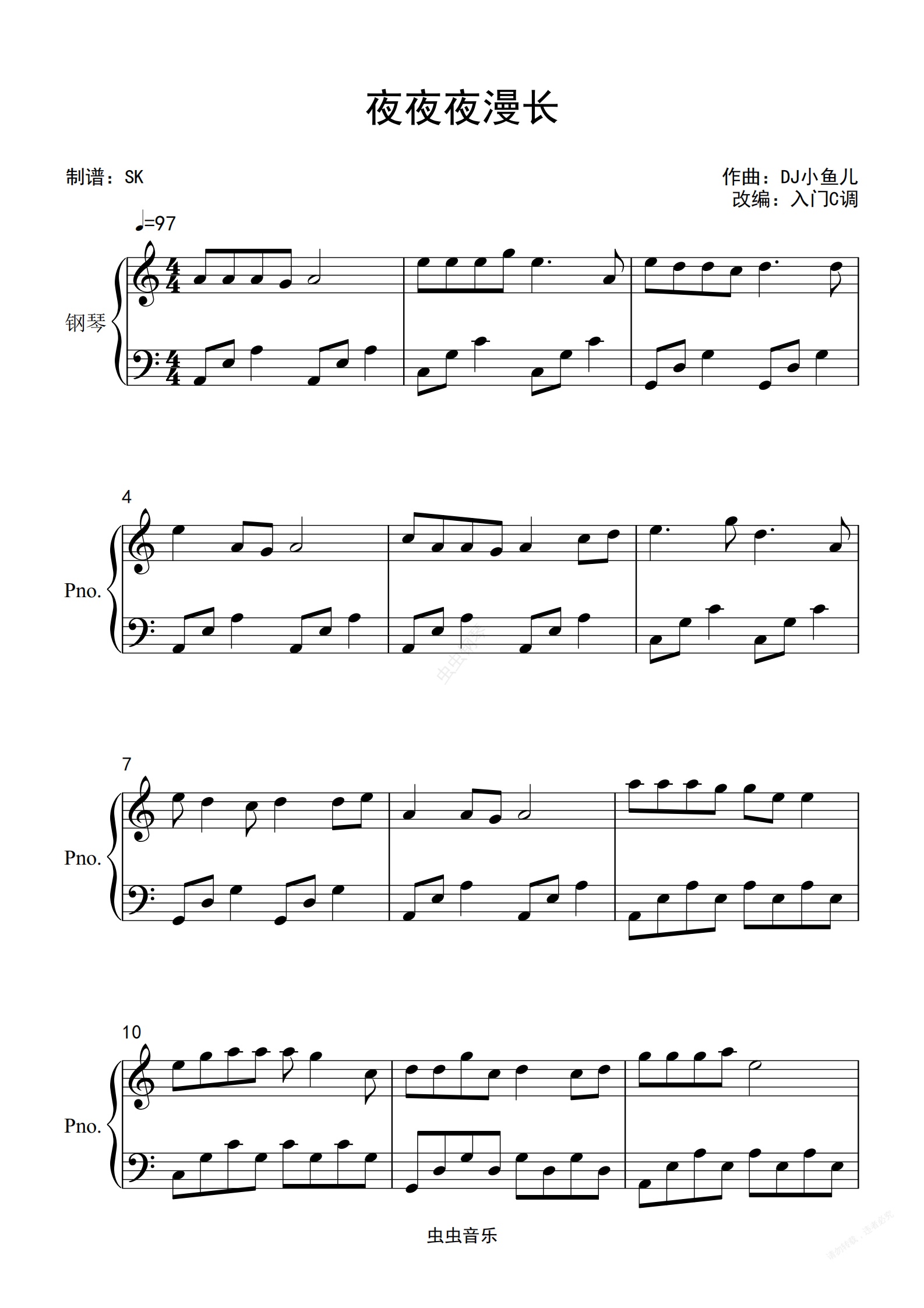 钢琴谱:DJ小鱼儿《夜夜夜漫长》C调简单版