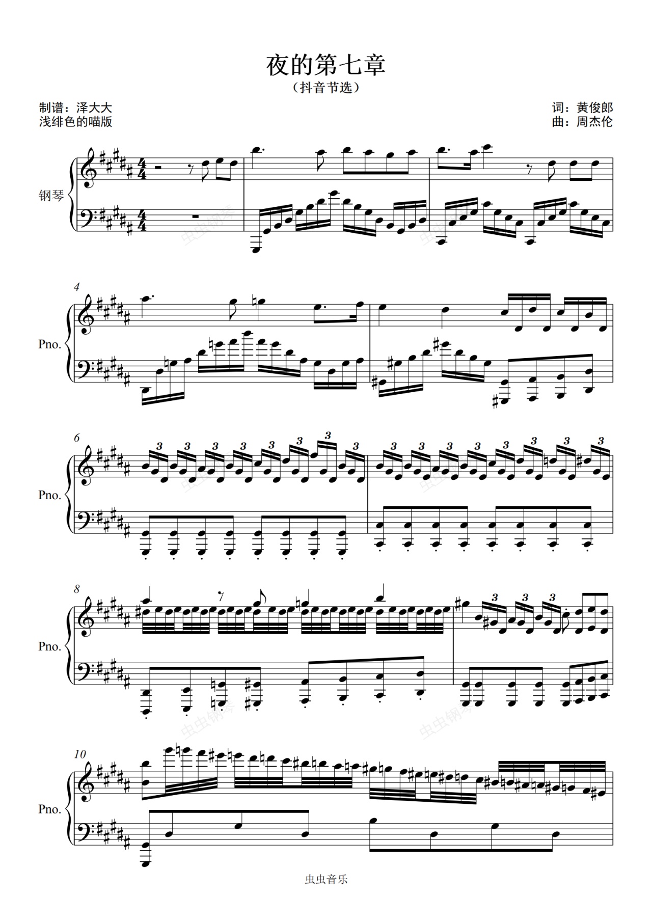 钢琴谱:夜的第七章【抖音浅绯色的喵版】泽大大 周杰伦