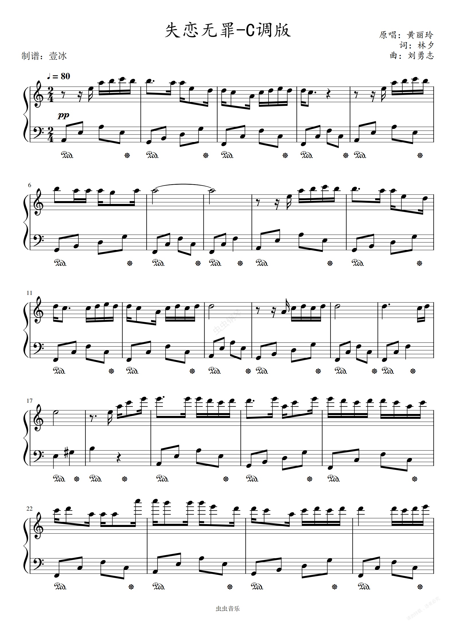 钢琴谱:失恋无罪//黄丽玲-C调简单易上手