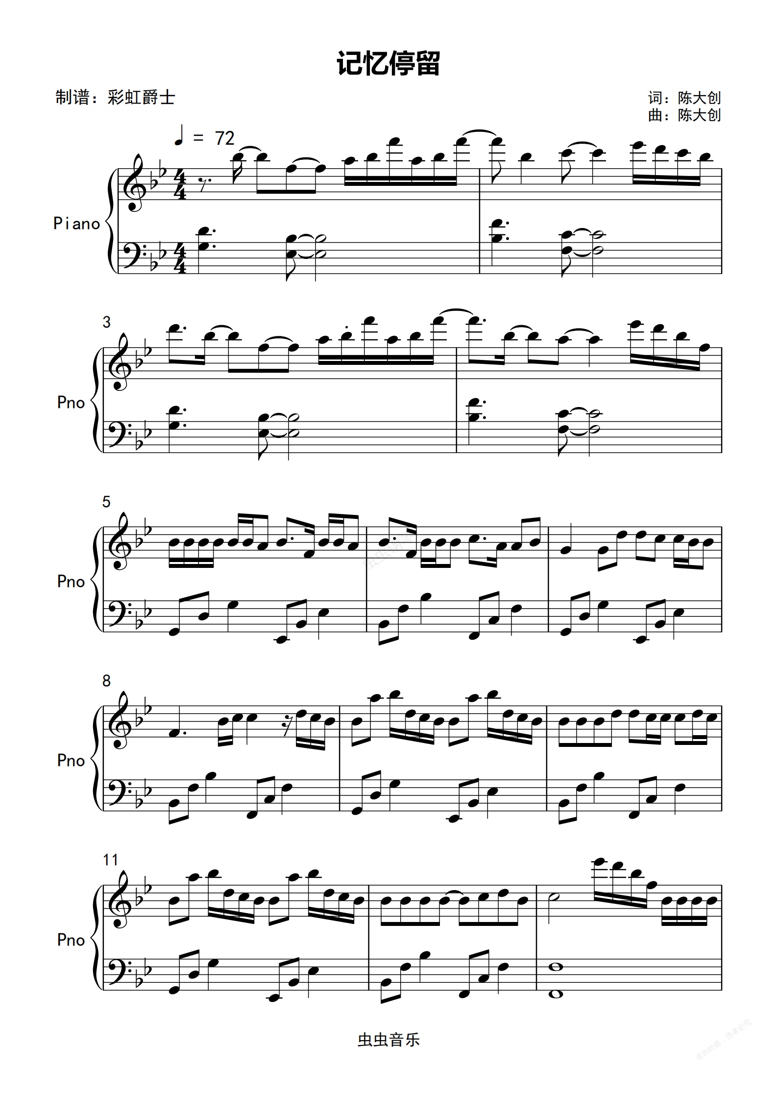 钢琴谱:记忆停留 原调简单版  抖音
