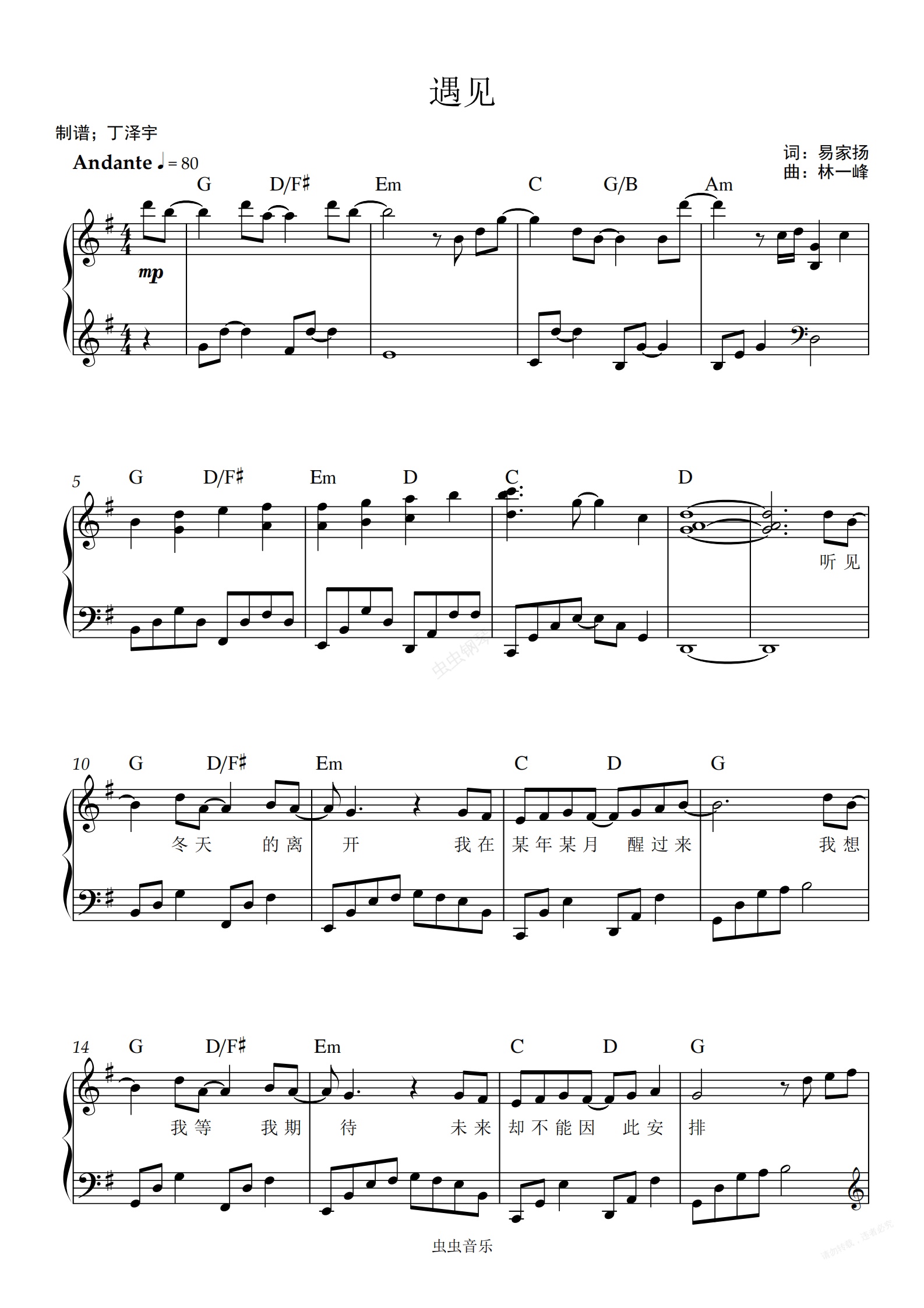 遇见-孙燕姿钢琴独奏弹唱曲带歌词和弦标记