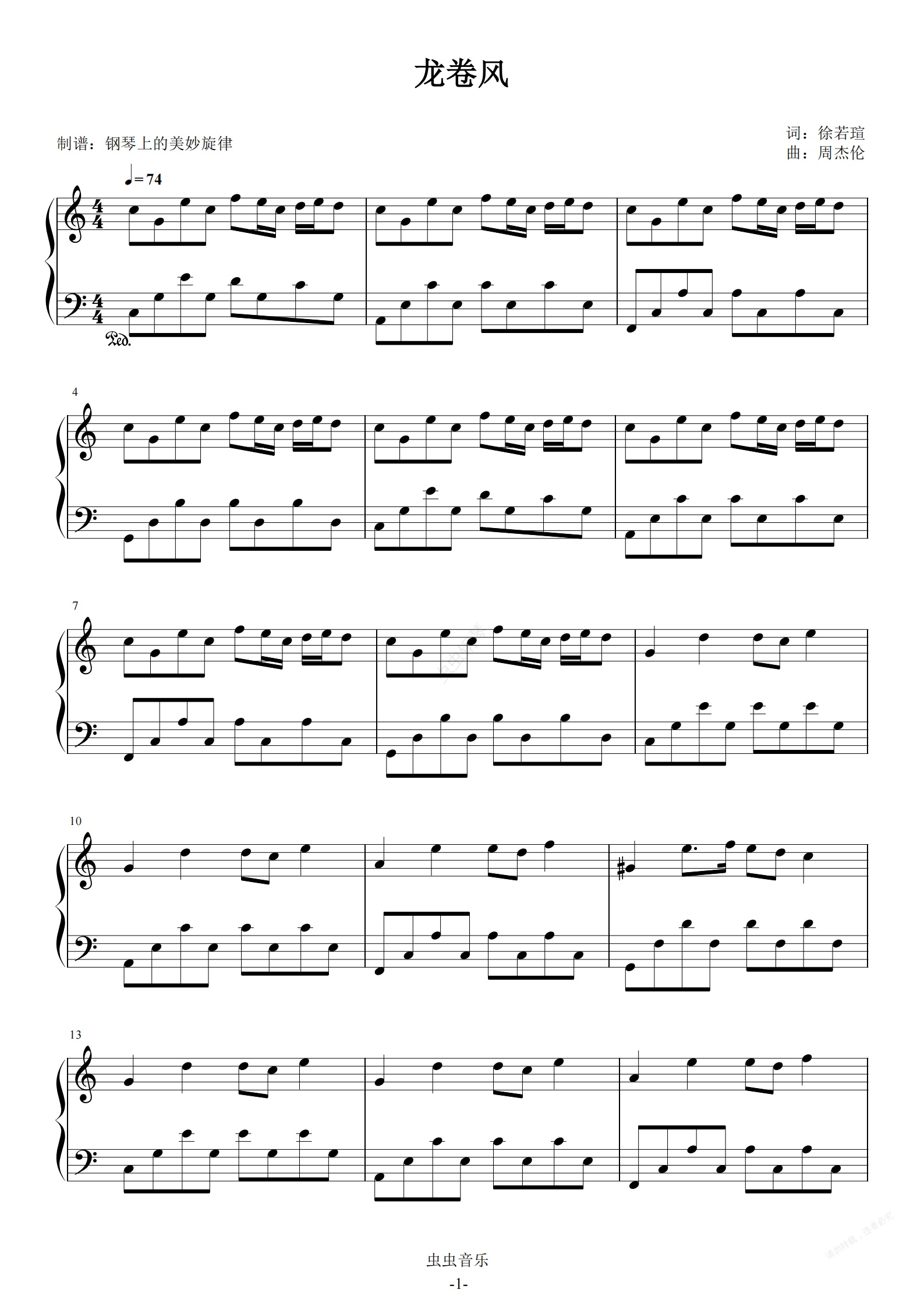 钢琴谱:龙卷风 周杰伦 C调简易版