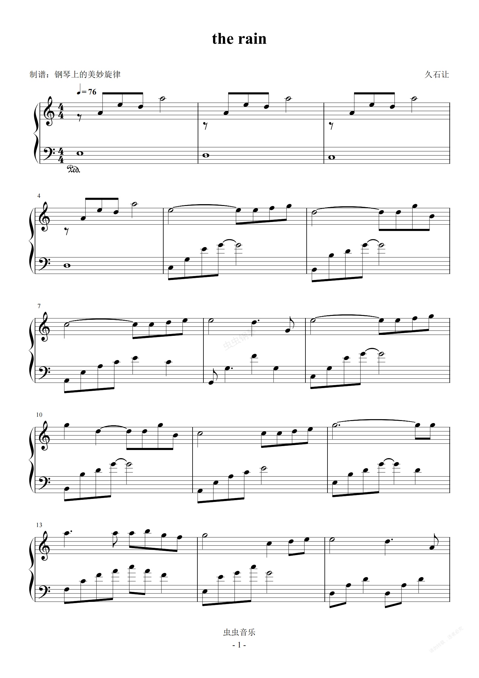 钢琴谱:the rain 久石让 C调 简易版