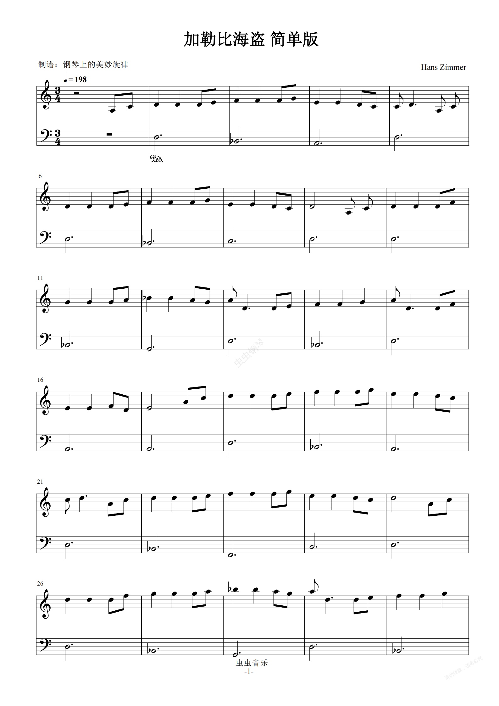 钢琴谱:加勒比海盗主题曲(Hes a Pirate) C调简单 初学版