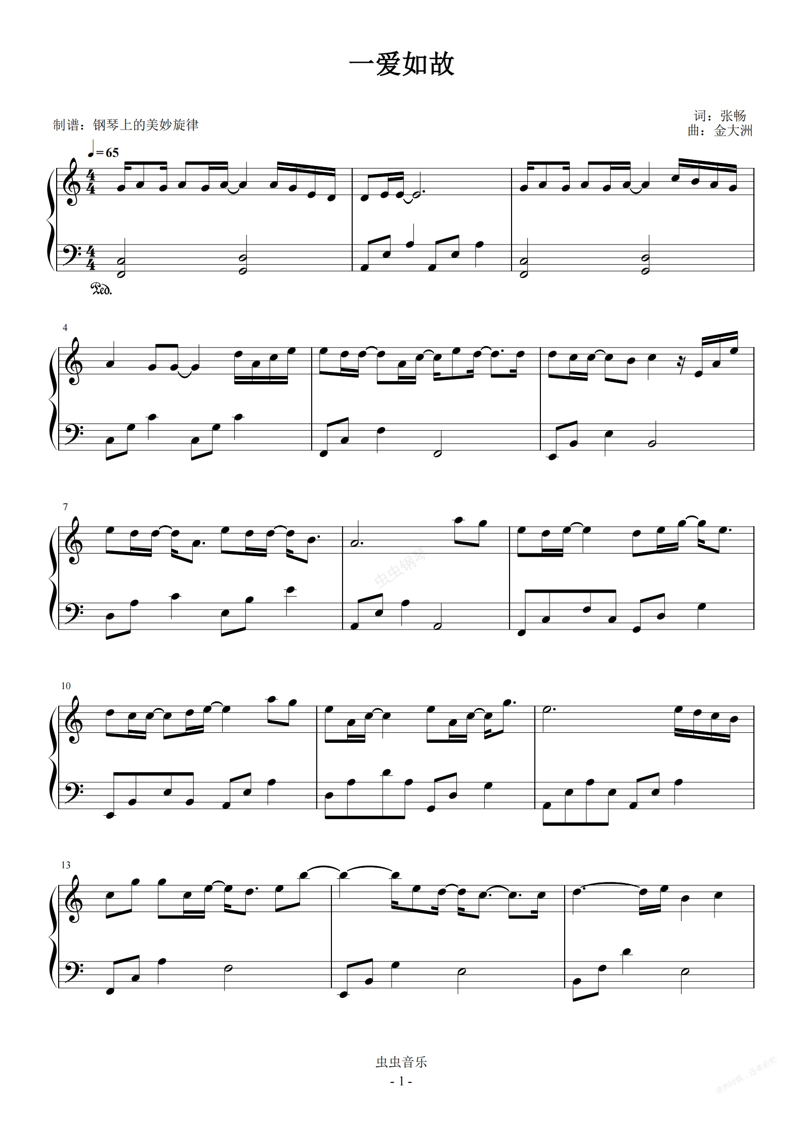 钢琴谱:一爱如故 C调简易版