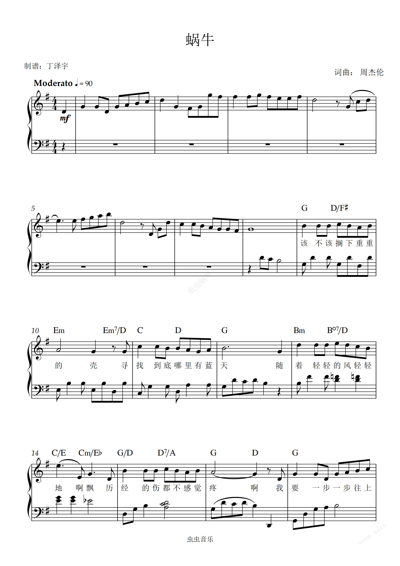 蜗牛-周杰伦 独奏弹唱谱带歌词对应和弦标记