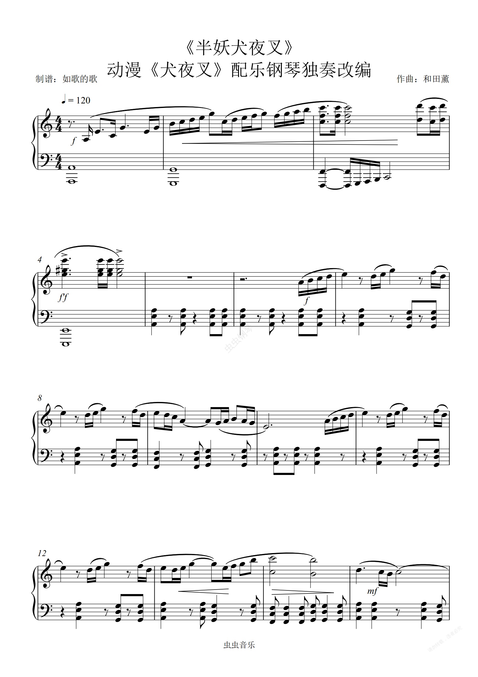 钢琴谱:《半妖犬夜叉》犬夜叉动漫配乐钢琴还原