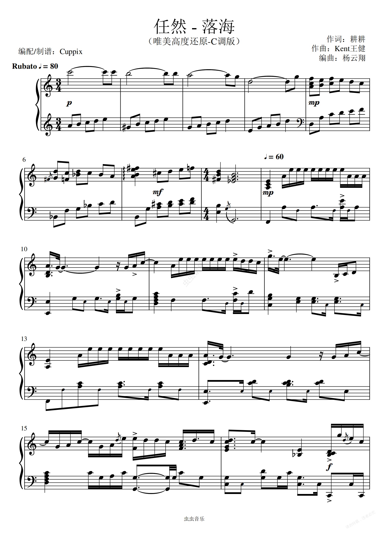 钢琴谱:任然《落海》唯美高度还原-C调版(Cuppix编配)
