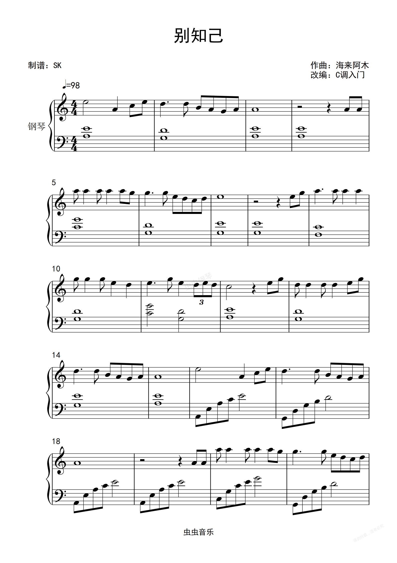 钢琴谱:海来阿木《别知己》C调简单抒情版