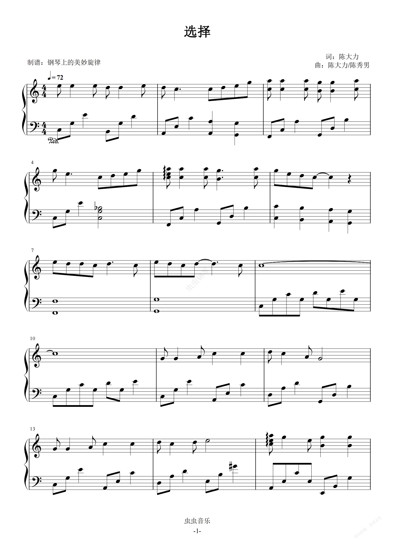 钢琴谱:选择 经典情歌C调