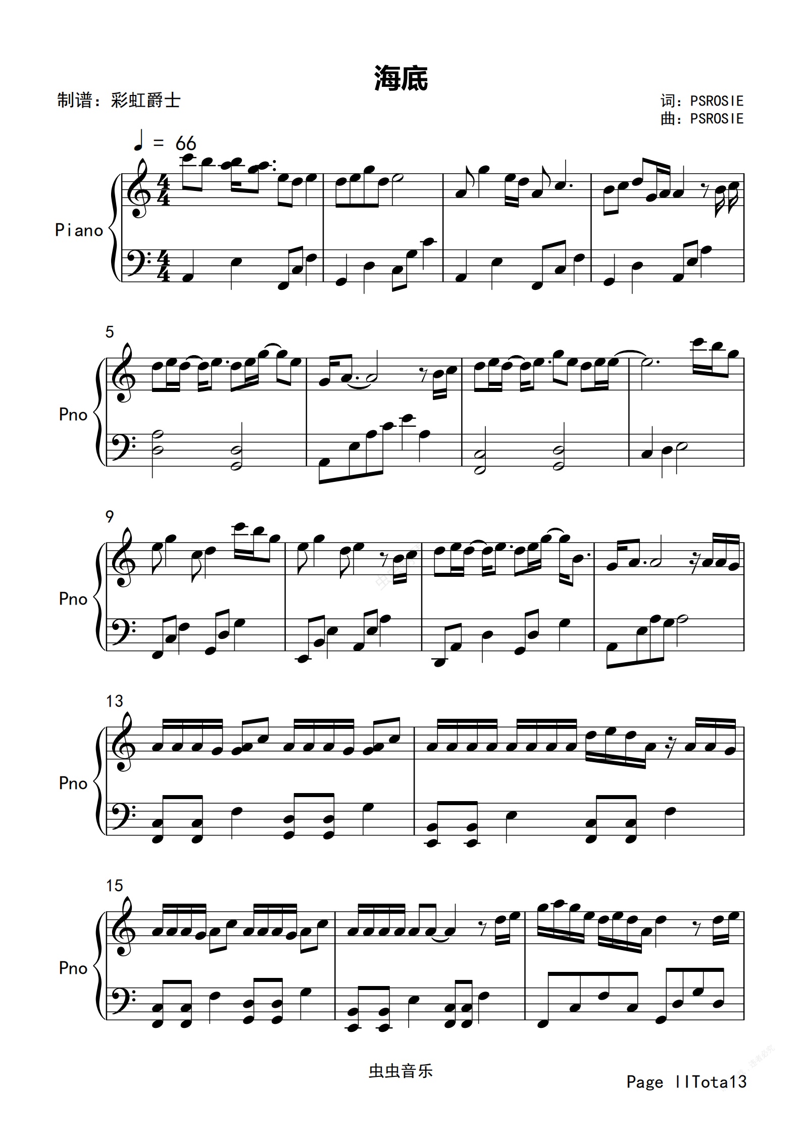 钢琴谱:海底- 钢琴简单版-抖音热歌
