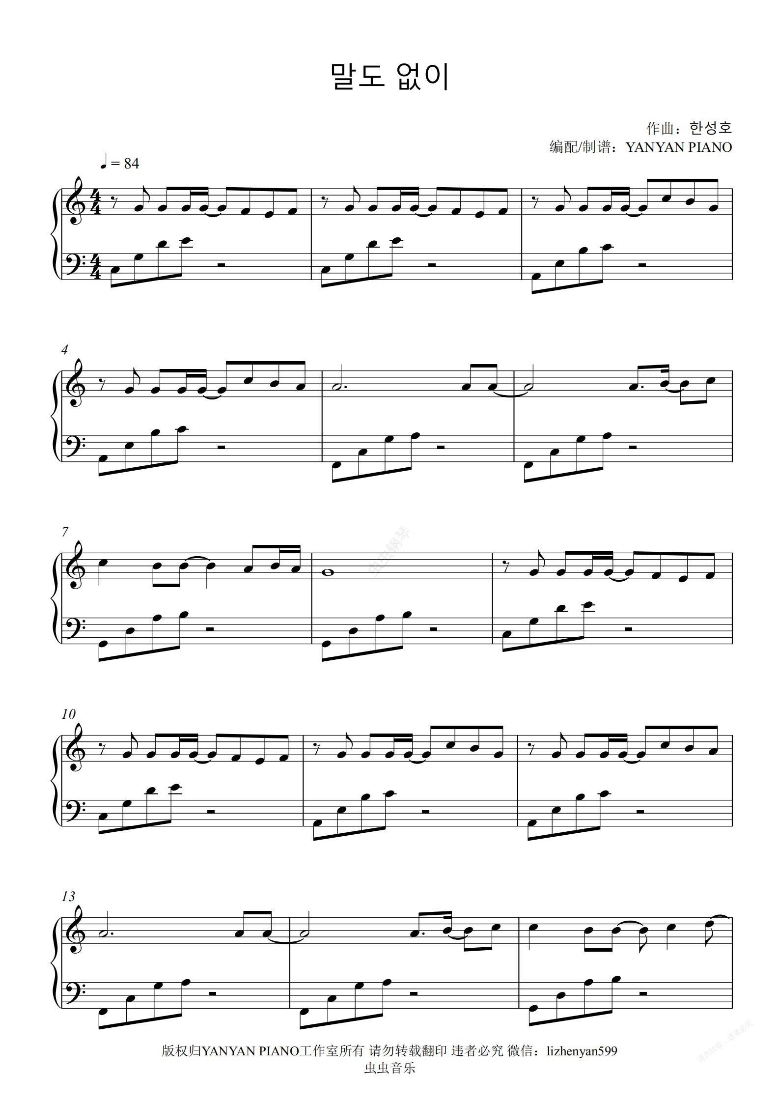 钢琴谱:原来是美男啊【默默无语】【말도 없이】张根硕 朴信惠