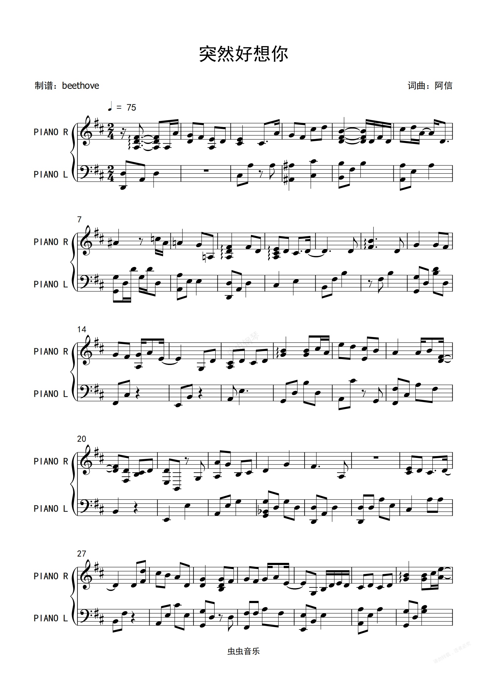 钢琴谱:突然好想你(五月天原版)